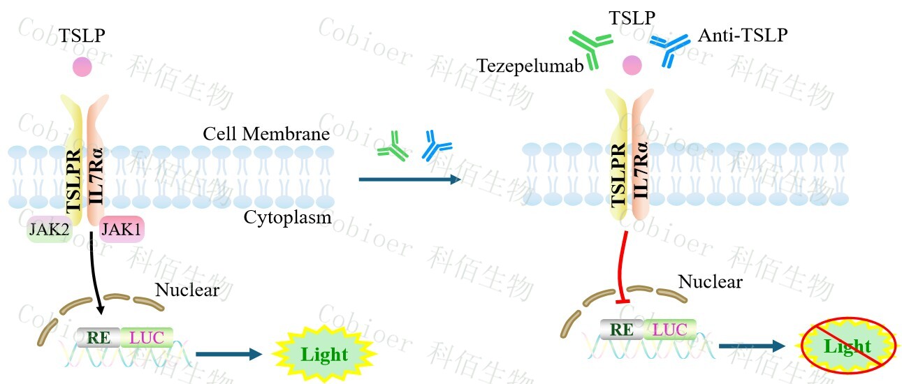 TSLP Effector Reporter Cell 報告基因藥靶模型很好的模擬了體內(nèi) TSLP 的信號轉(zhuǎn)導(dǎo)過程,原理見下圖所示。![]() Figure 1. TSLP Effector Reporter Cell 細(xì)胞模型原理圖  |