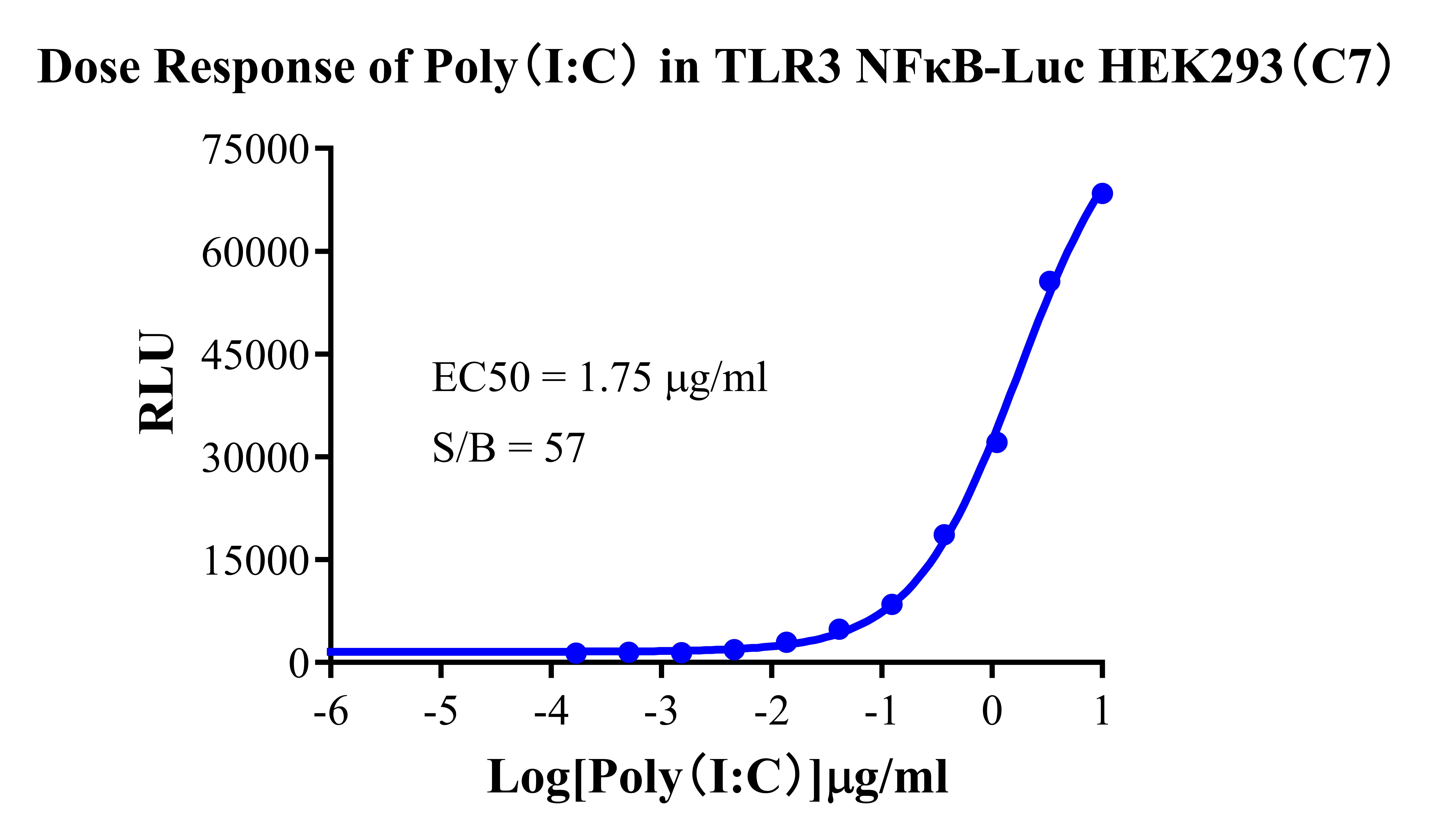 Figure 1. Detect Luciferase assay by Ultra Luciferase Detection Kit CBPH0001(we strongly suggest to purchase from Cobioer). Dose Response of Poly(I:C) in TLR3 NFκB-Luc HEK293(C7).