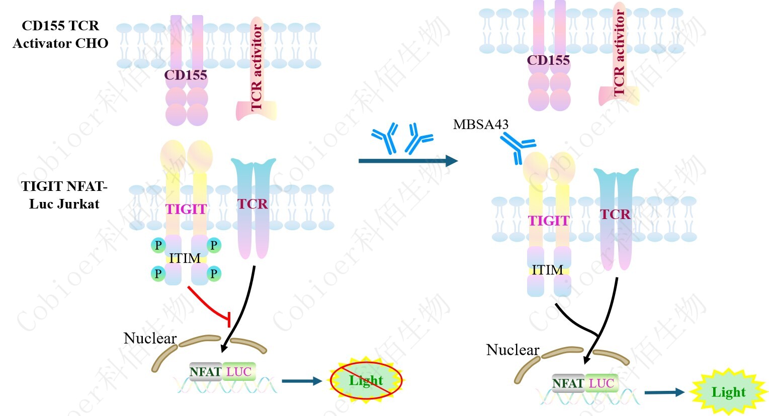 CD155 TCR Activator CHO 細胞作為 TIGIT NFAT-Luc Jurkat 細胞的靶細胞,很好的模 擬了體內(nèi) TIGIT 的信號轉(zhuǎn)導過程,原理見下圖所示。