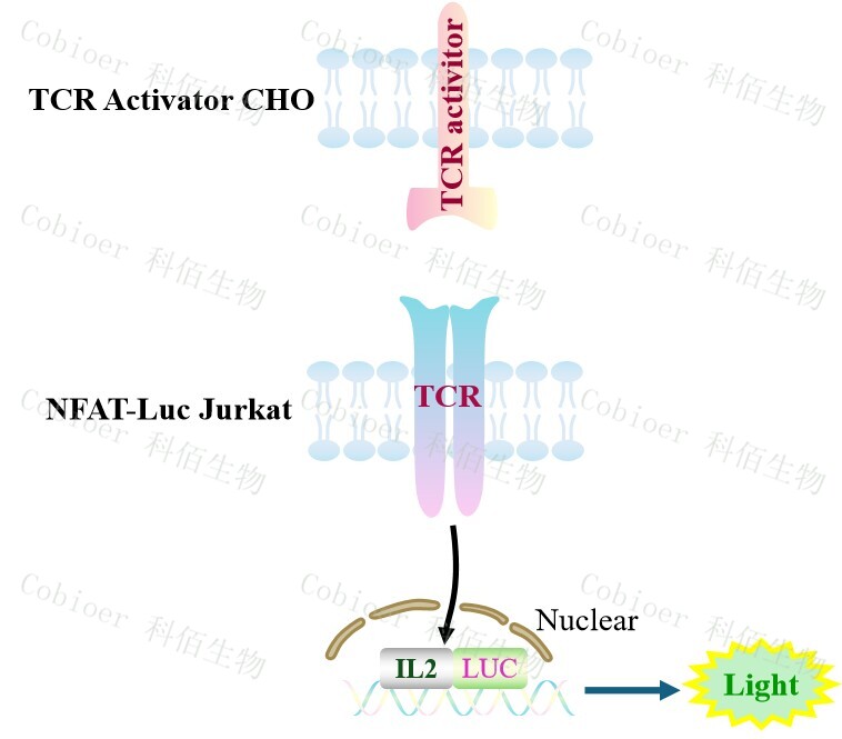TCR Activator CHO 報告基因藥靶模型很好的模擬了體內(nèi) TCR 的信號轉(zhuǎn)導(dǎo)過程,原理見下圖所示。![]() Figure 1. TCR Activator CHO 細胞模型原理圖  |