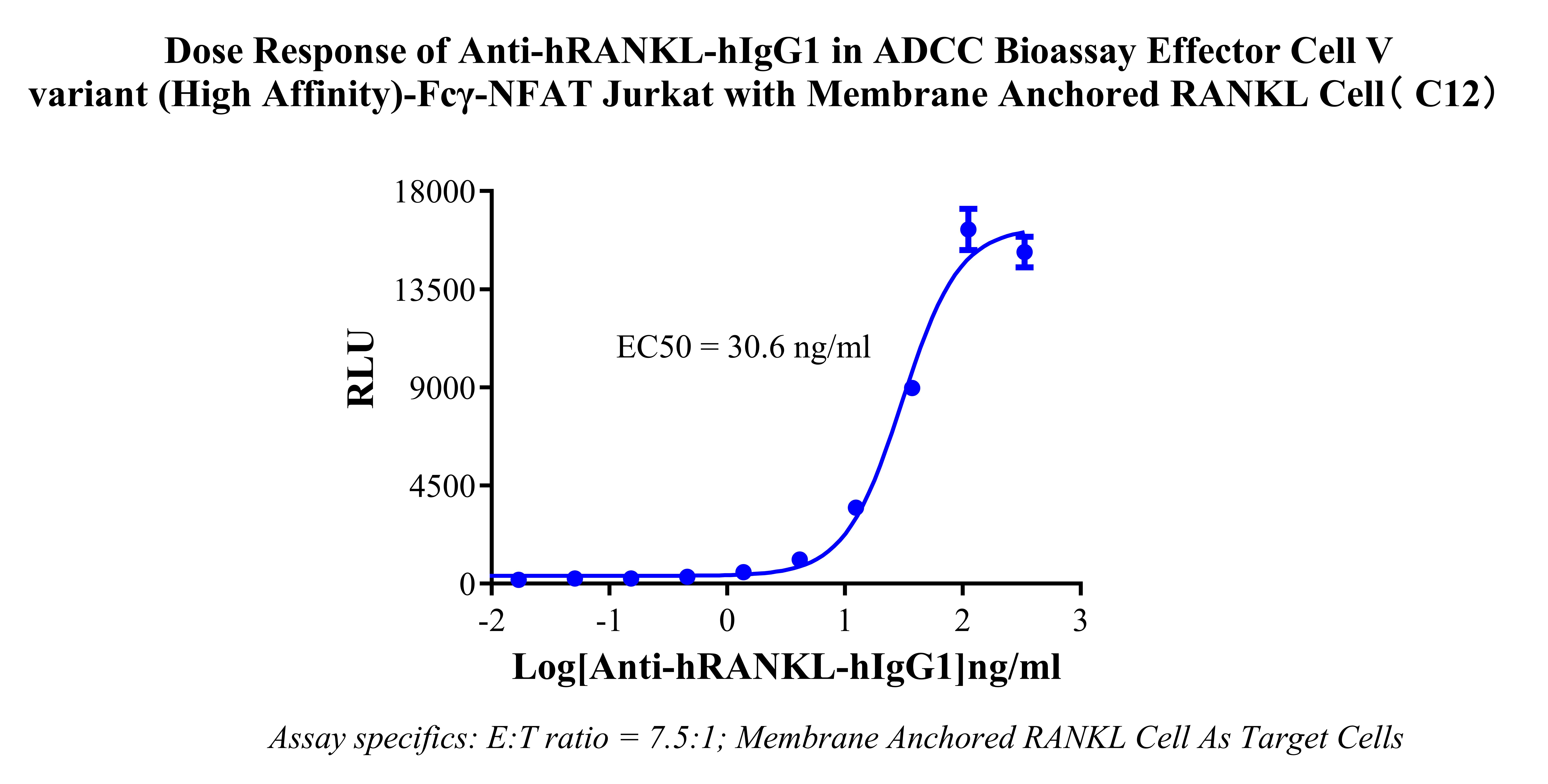 Figure 2. Dose response of Anti-hRANKL-hlgG1in ADCC Bioassay Effector Cell variant (High Affinity)-Fcγ-NFAT Jurkat with Membrane Anchored RANKL Cell (C12).