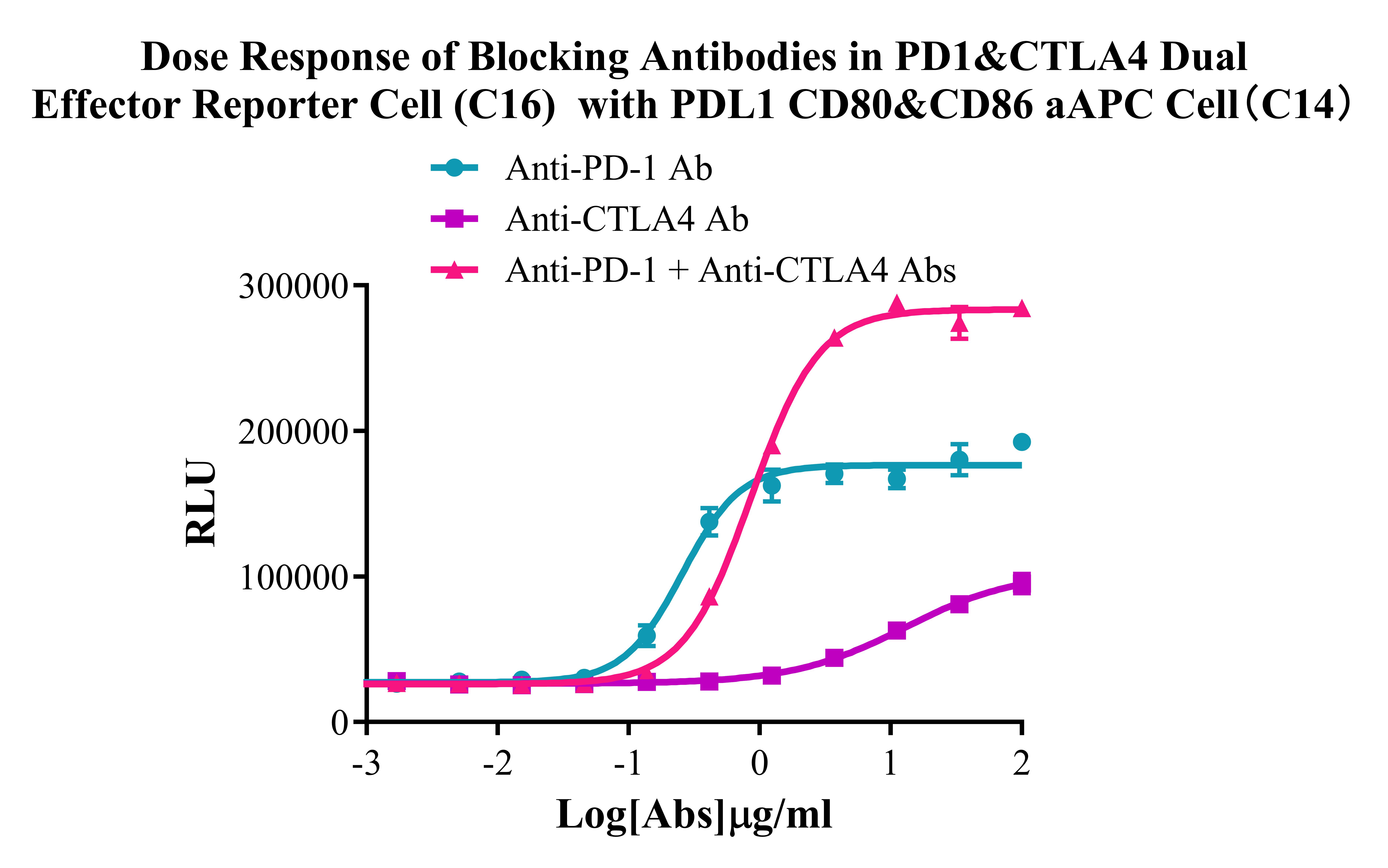 Figure 1. Dose Response of Blocking Antibodies in PD1&CTLA4 Dual Effector Reporter Cell (C16) With PD-L1 CD80&CD86 aAPC Cell (C14).  |