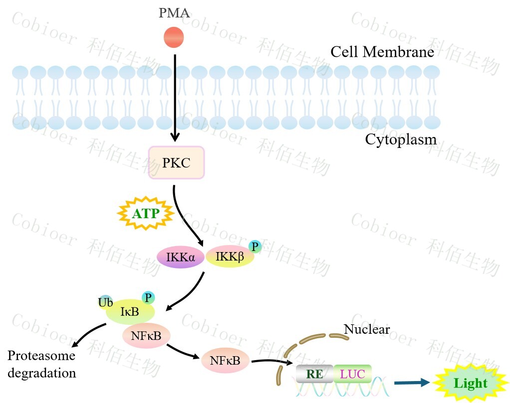 NFκB-Luc Jurkat 報(bào)告基因細(xì)胞是由 NFκB 調(diào)控并表達(dá) Luc 熒光素酶報(bào) 告基因的 Jurkat細(xì)胞。PMA 是 DAG(二酯酰甘油)的類似物,可自由的通過(guò)細(xì)胞膜,直接 作用于細(xì)胞活化信號(hào)轉(zhuǎn)導(dǎo)通路上的 PKC,原理見(jiàn)下圖所示。![]() Figure 1:NFκB-Luc Jurkat 細(xì)胞模型原理圖
