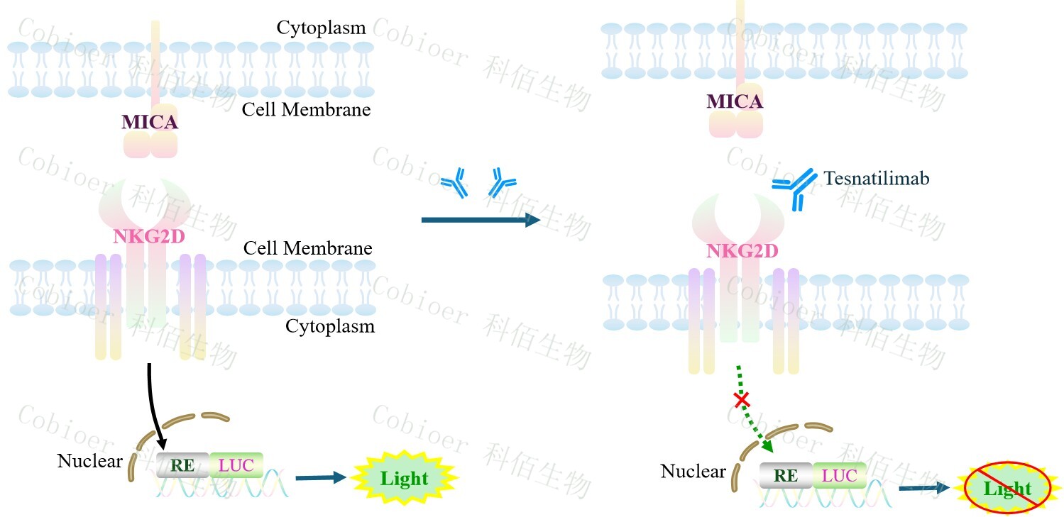 MICA CHO 作為 NKG2D Effector Reporter Cell 的靶細(xì)胞,很好的模擬了體內(nèi) NKG2D 的信號轉(zhuǎn)導(dǎo)過程,原理見下圖所示。![]() Figure 1. MICA CHO 細(xì)胞構(gòu)建原理圖  |