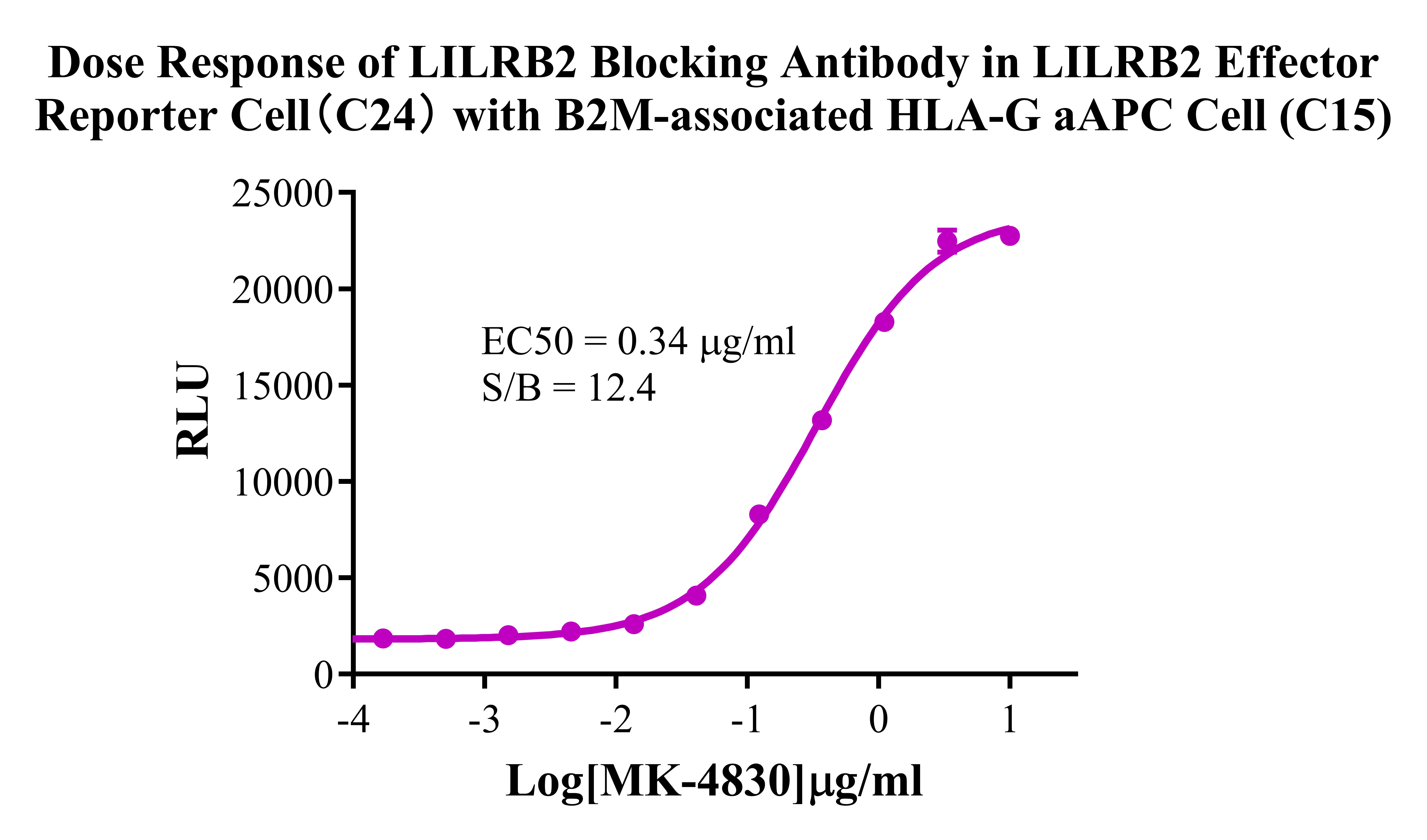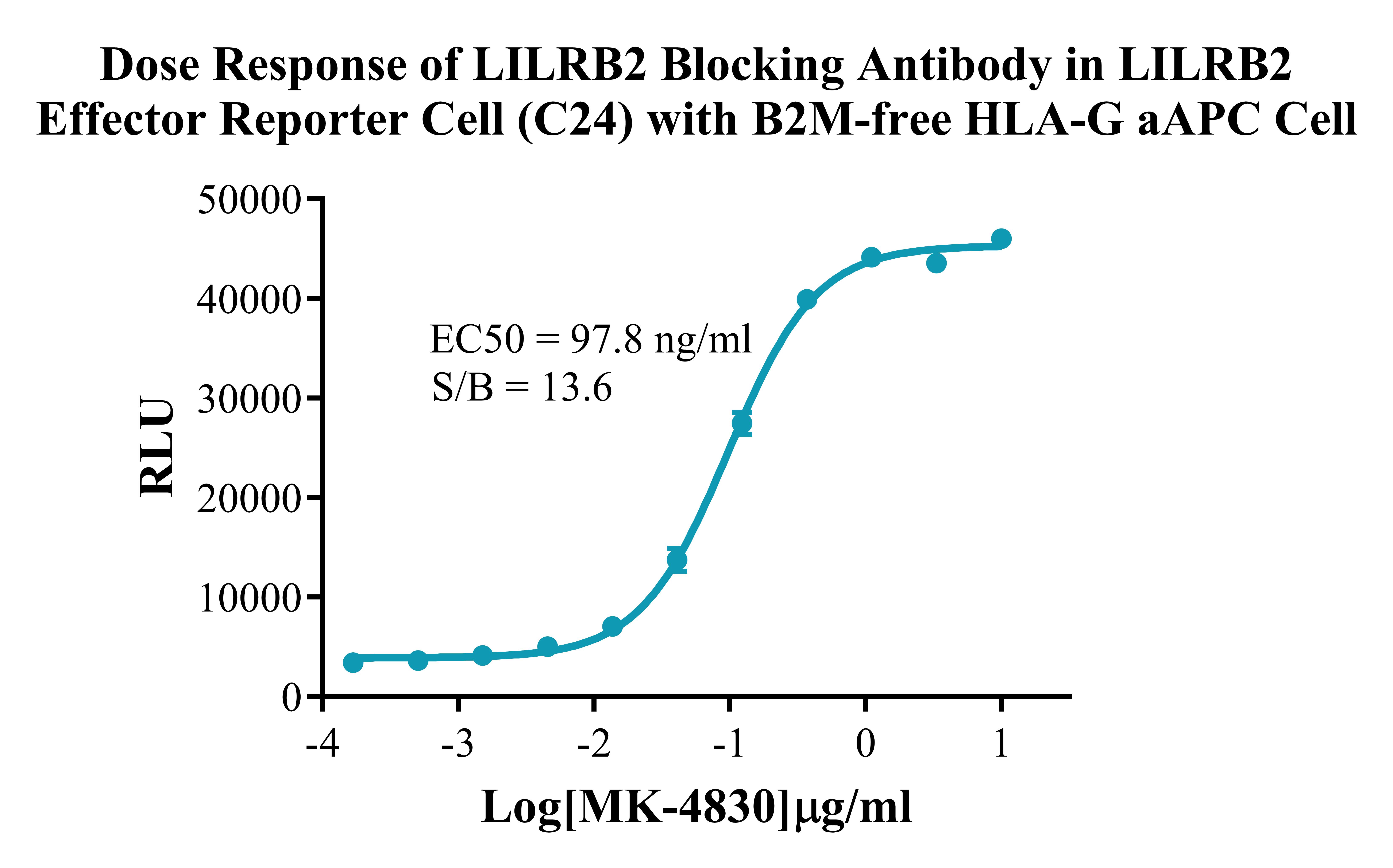 Figure 3.Dose Response of LILRB2 Blocking Antibody in LILRB2 Effector Reporter Cell (C24) With B2M-associated HLA-G/aAPC Cells(C15).  |