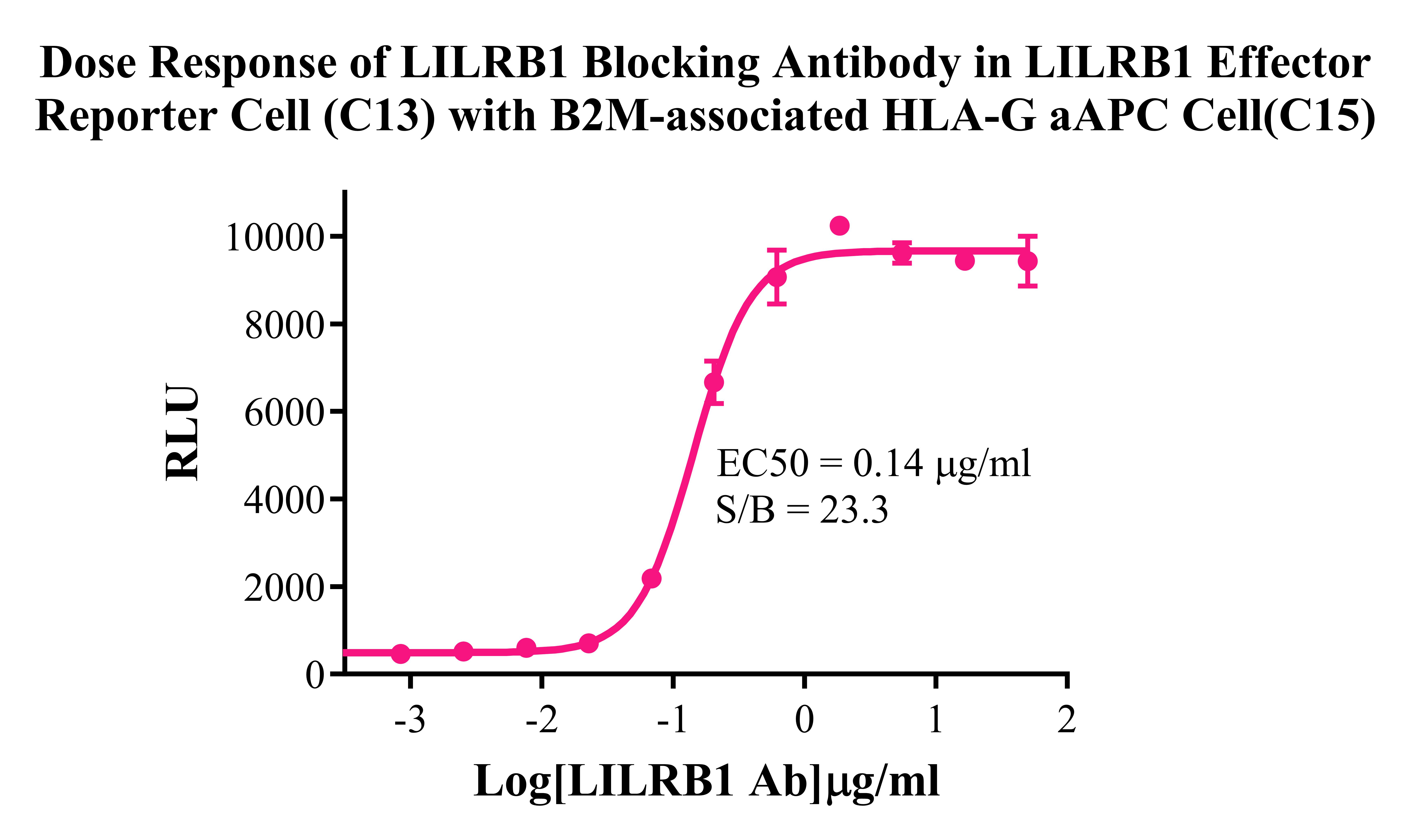 Figure 2.Dose Response of LILRB1 Blocking Antibody in LILRB1 Effector Reporter Cell (C13)With B2M-associated HLA-G/aAPC Cells (C15).  |