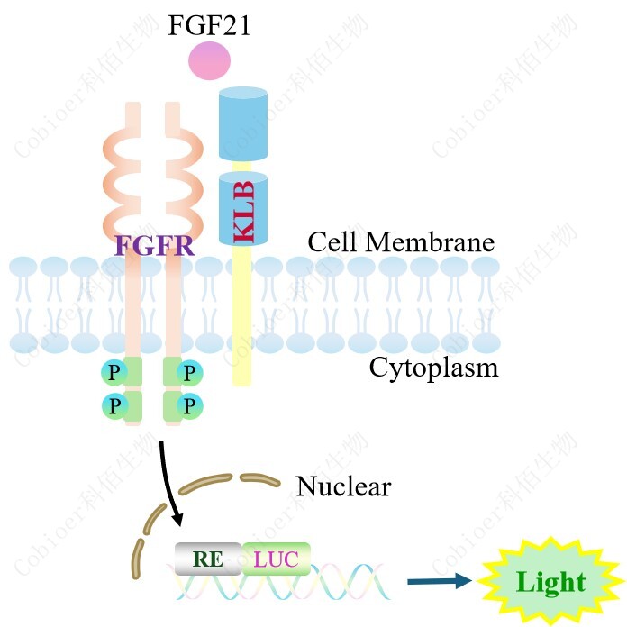 KLB Effector Reporter Cell 報告基因藥靶模型很好的模擬了體內(nèi) KLB 的信號轉(zhuǎn)導(dǎo)過程, 原理見下圖所示。 ![]() Figure 1. KLB Effector Reporter Cell 細(xì)胞模型原理圖