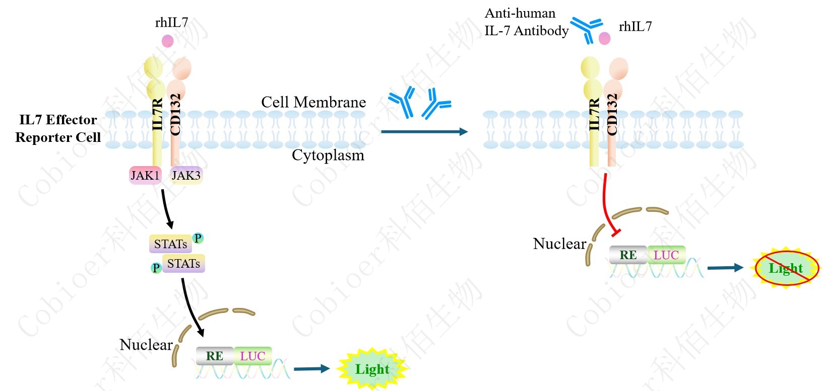 IL7 Effector Reporter Cell 報(bào)告基因藥靶模型很好的模擬了體內(nèi) IL7 的信號(hào)轉(zhuǎn)導(dǎo)過(guò)程,原理見(jiàn)下圖所示。![]() Figure 1. IL7 Effector Reporter Cell 模型原理圖  |