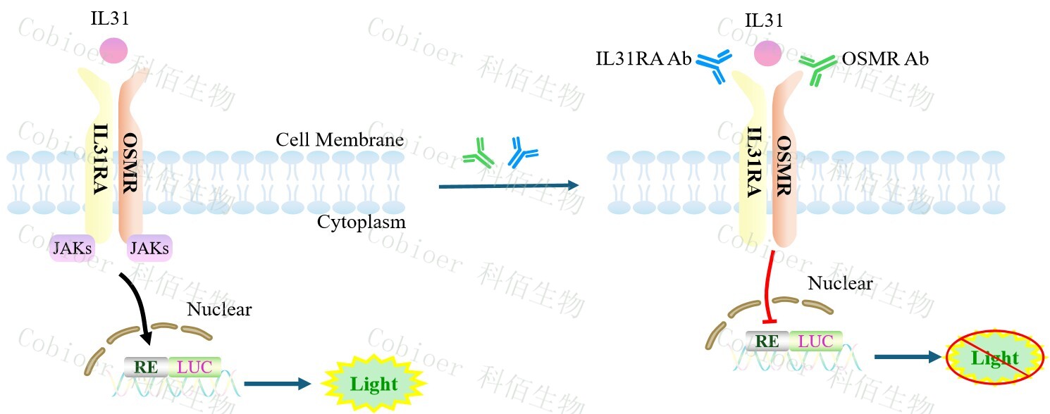 IL31 Effector Reporter報告基因藥靶模型很好的模擬了體內 IL31的信號轉導過程,原理見下圖所示。![]() Figure 1. IL31 Effector Reporter Cell 細胞模型原理圖