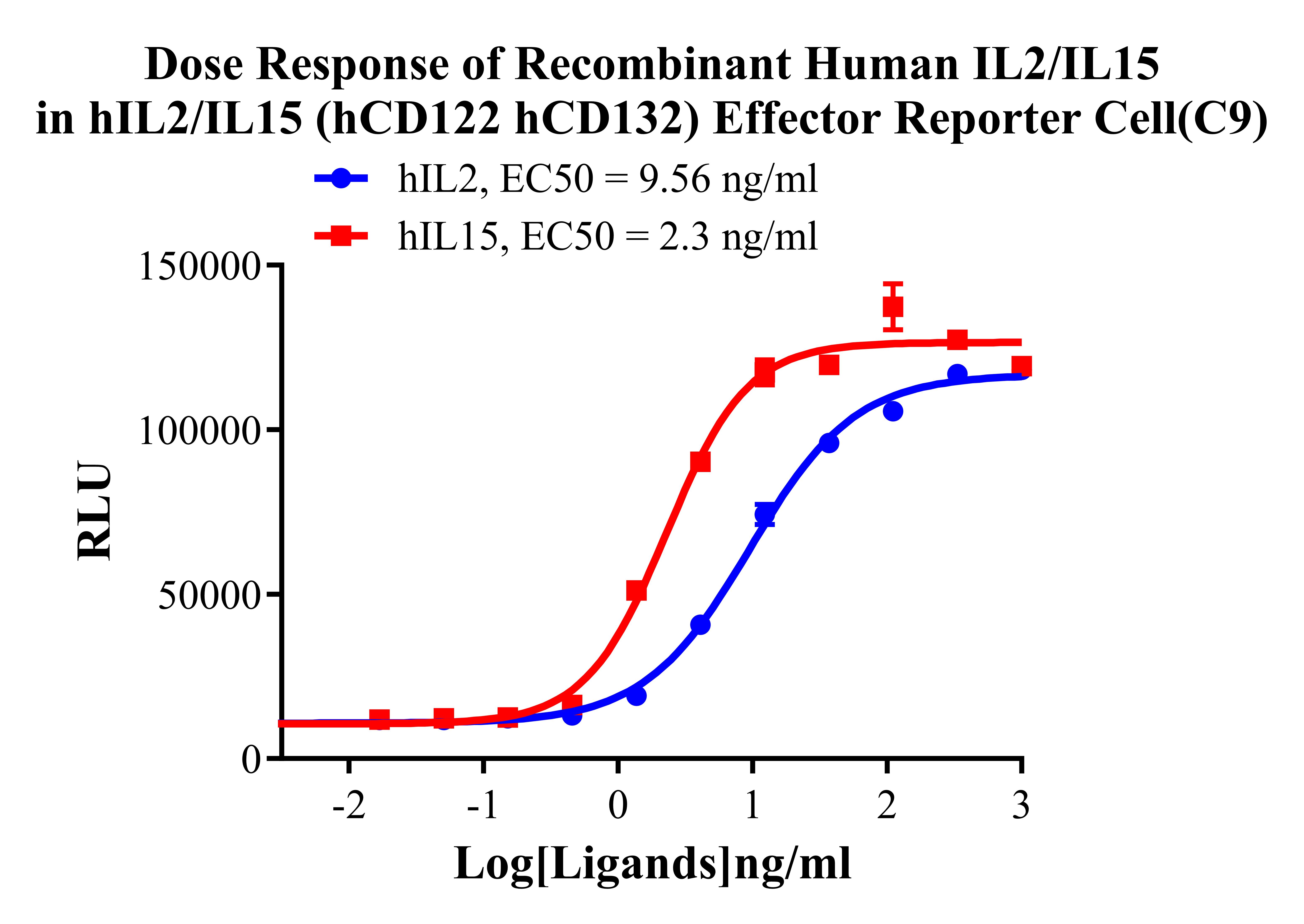 Figure 5. Dose Response of Recombinant Human IL2/IL15 in hlL2/IL15 Effector(hCD122/hCD132)  Effector Reporter Cells (C9).  |