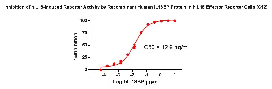 Figure 2.Inhibition of hIL18-Induced Reporter Activity By Recombinant Human IL18 BP Protein in hIL18 Effector Reporter Cells(C12).  |