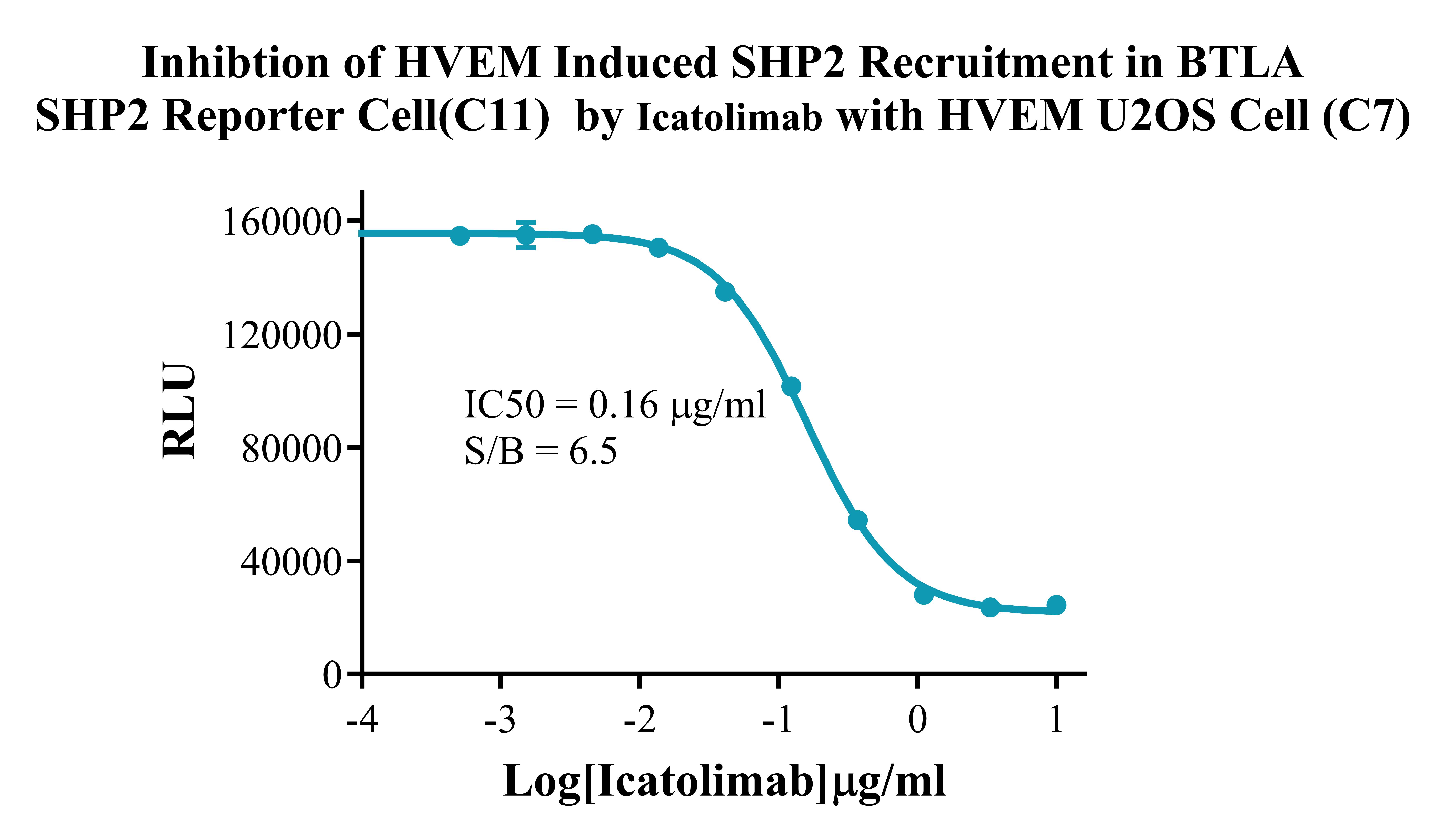 Figure 2. Inhibtion of HVEM Induced SHP2 Recruitment In BTLA SHP2 Reporter Cell (C11) By Icatolimab with HVEM U2OS Cell (C7).  |