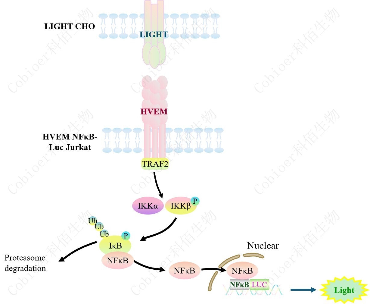 HVEM NFκB-Luc Jurkat 報(bào)告基因藥靶模型很好的模擬了體內(nèi) HVEM 的信號(hào)轉(zhuǎn)導(dǎo)過(guò)程, 原理見(jiàn)下圖所示。![]() Figure 1. HVEM NFκB-Luc Jurkat 細(xì)胞模型原理圖  |