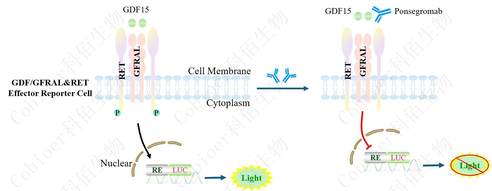 GDF/GFRAL&RET Effector Reporter Cell 報(bào)告基因藥靶模型很好的模擬了體內(nèi) GDF 的 信號(hào)轉(zhuǎn)導(dǎo)過程,原理見下圖所示。![]() Figure 1. GDF/GFRAL&RET Effector Reporter Cell 模型原理圖  |