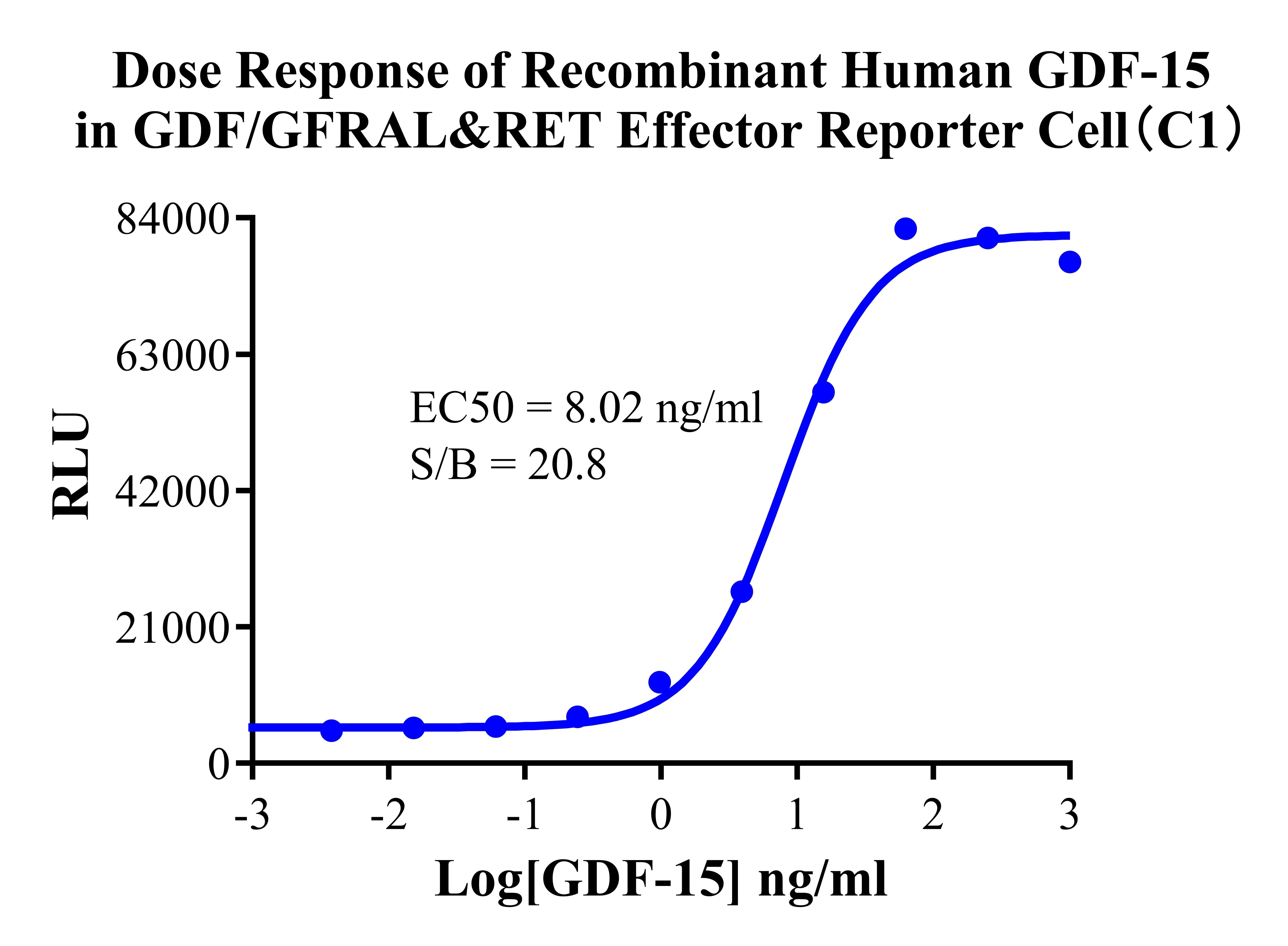 Figure 4.Dose Response of Recombinant Human GDF-15 in GDF/GFRAL&RET Effector Reporter Cells (C1).  |