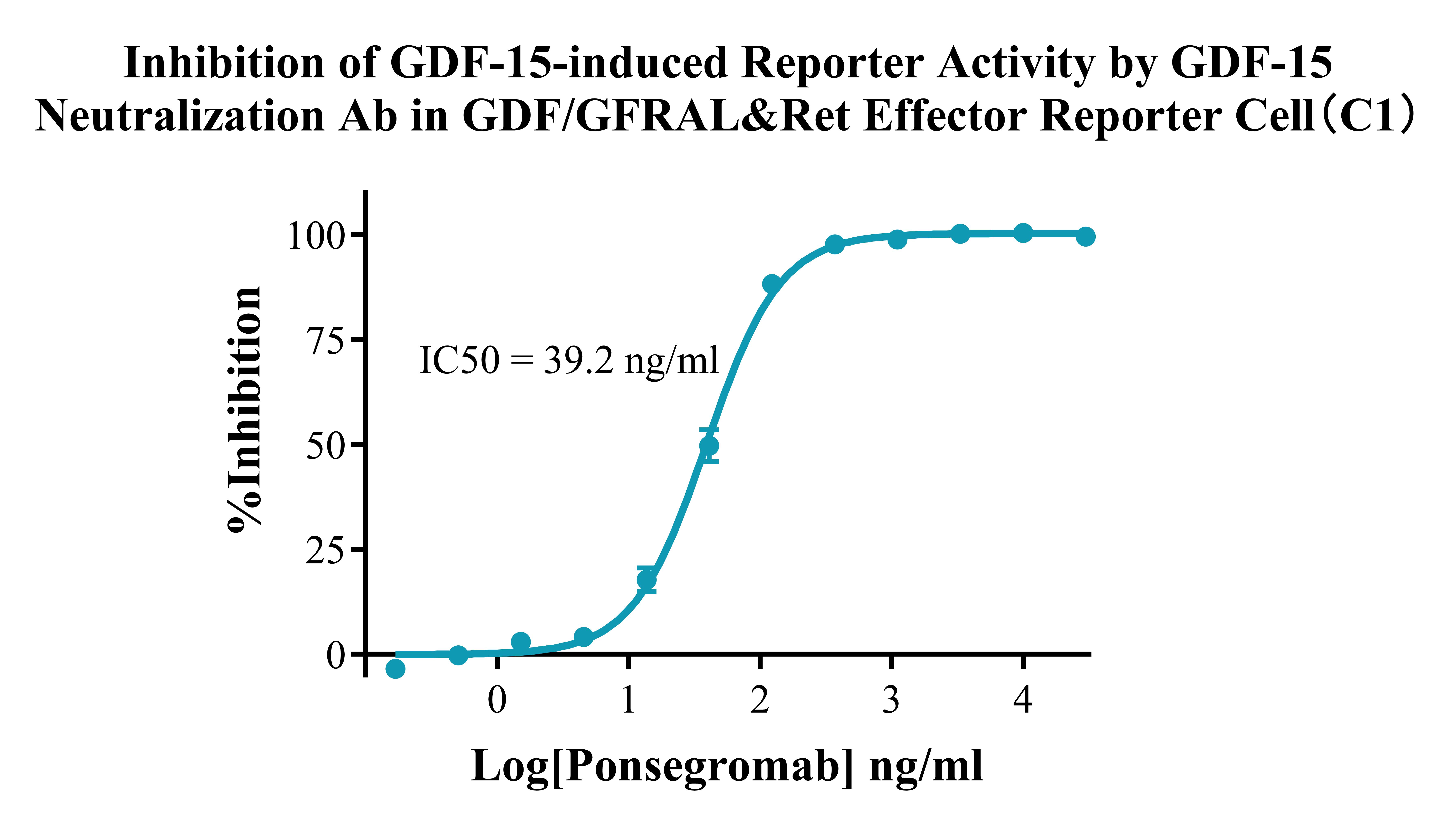 Figure 5.Inhibition of GDF-15-induced Reporter Activity by GDF-15 Neutralization Ab in GDF/GFRAL&Ret Effector Reporter Cell (C1).  |