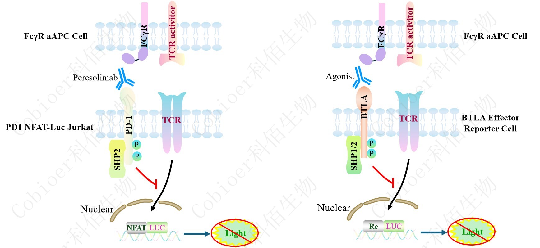 FcγR aAPC Cell在基礎(chǔ)細(xì)胞上穩(wěn)定表達(dá) FcγR 和 aAPC。FcγR aAPC Cell 作為 PD1 NFAT-Luc Jurkat Cell/BTLA Effector Reporter Cell 的靶細(xì)胞進(jìn)行功能檢測(cè)的原 理圖見(jiàn)下圖所示。![]() Figure 1. FcγR aAPC Cell 的原理圖  |