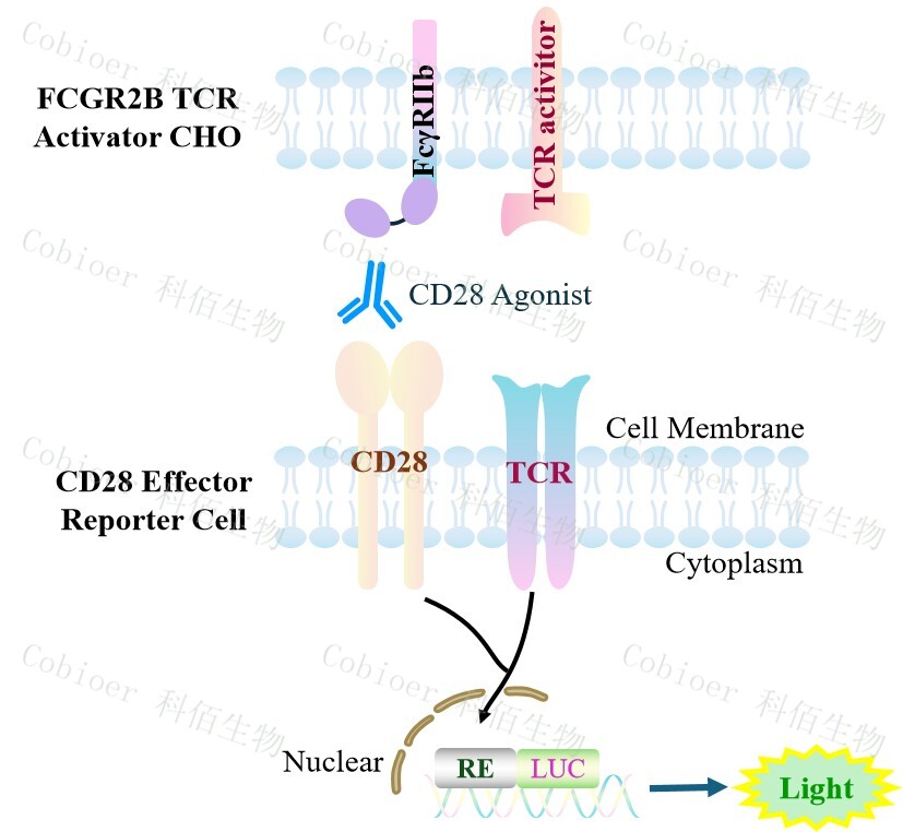 CD28 Effector Reporter Cell 報告基因藥靶模型很好的模擬了體內(nèi) CD28 的信號轉(zhuǎn)導(dǎo)過 程,原理見下圖所示。 ![]() Figure 1. CD28 Effector Reporter Cell 細胞模型原理圖  |