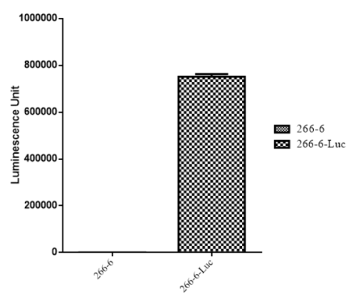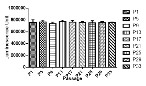 Figure. Stablity test results. 266-6-Luc cells showed at least 32 passage stability with similar luminescence unit.  |