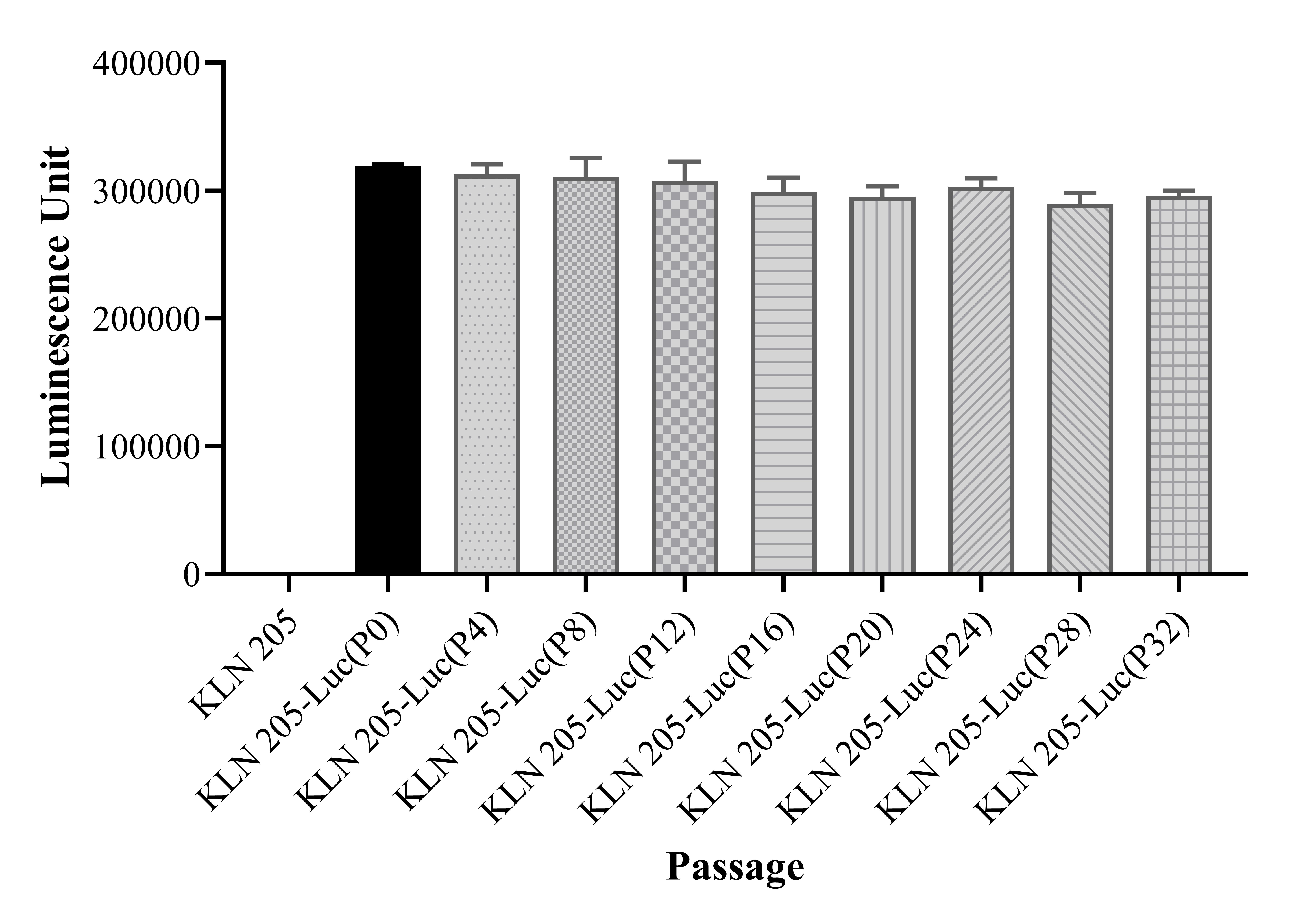 Figure 1. Stablity test results. KLN205-Luc cells showed at least 32 passage stability with similar luminescence unit.