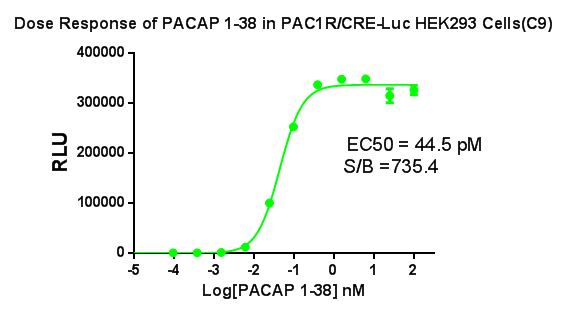 Figure 2.Detect Luciferase assay by Ultra Luciferase Detection Kit CBPH0001(we strongly suggest to purchase from Cobioer). Dose Response of PACAP 1-38 in PAC1R/CRE-Luc HEK293 Cells(C9).  |