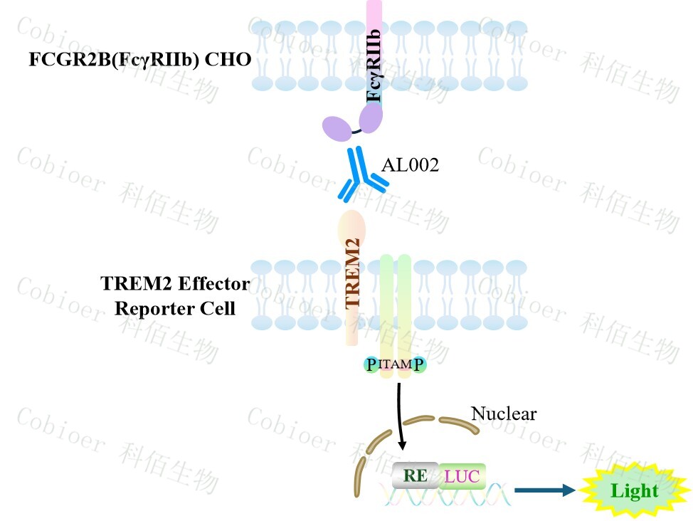 TREM2 Effector Reporter 報告基因藥靶模型很好的模擬了體內(nèi) TREM2 的信號轉(zhuǎn)導過程, 原理見下圖所示。