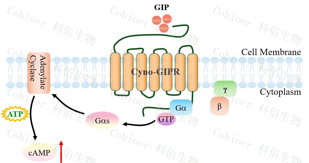 cAMP 在 G 蛋白偶聯(lián)受體(GPCR)信號(hào)轉(zhuǎn)導(dǎo)中是一種關(guān)鍵的第二信使。當(dāng)配體結(jié)合到 GPCR,構(gòu)象發(fā)生變化,激活受體接著激活G蛋白,Gs的激活導(dǎo)致腺苷酸環(huán)化酶調(diào)控cAMP 的升高。GIPR 藥靶模型很好的模擬了體內(nèi) GIPR 的信號(hào)轉(zhuǎn)導(dǎo)過程,原理見下圖所示。