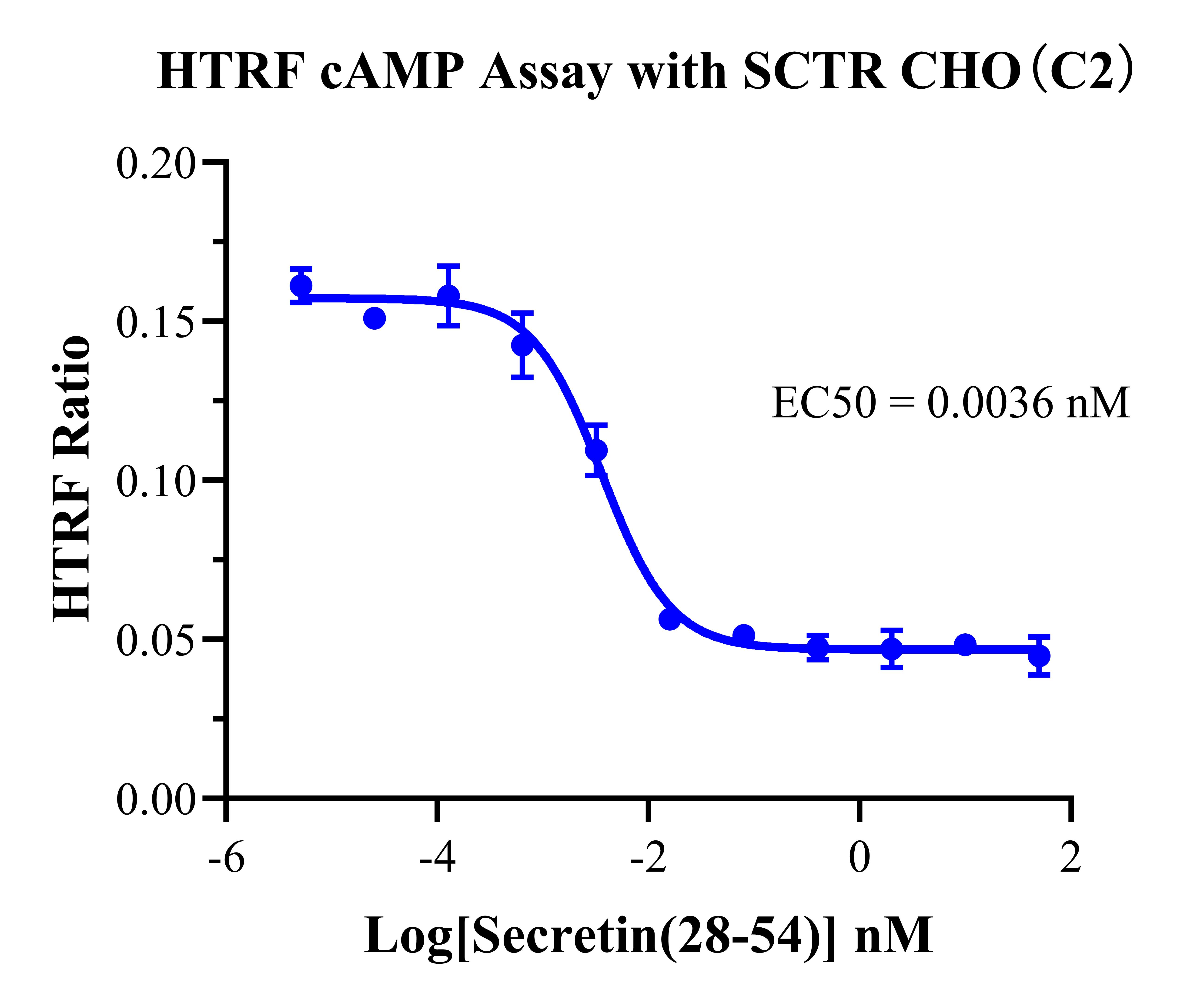 cAMP 在 G 蛋白偶聯(lián)受體(GPCR)信號轉(zhuǎn)導(dǎo)中是一種關(guān)鍵的第二信使。當(dāng)配體結(jié)合到 GPCR, 構(gòu)象發(fā)生變化,激活受體接著激活 G 蛋白,Gs 的激活導(dǎo)致腺苷酸環(huán)化酶調(diào)控 cAMP 的升高。 SCTR 藥靶模型很好的模擬了體內(nèi) SCTR 的信號轉(zhuǎn)導(dǎo)過程,原理見下圖所示。  |
