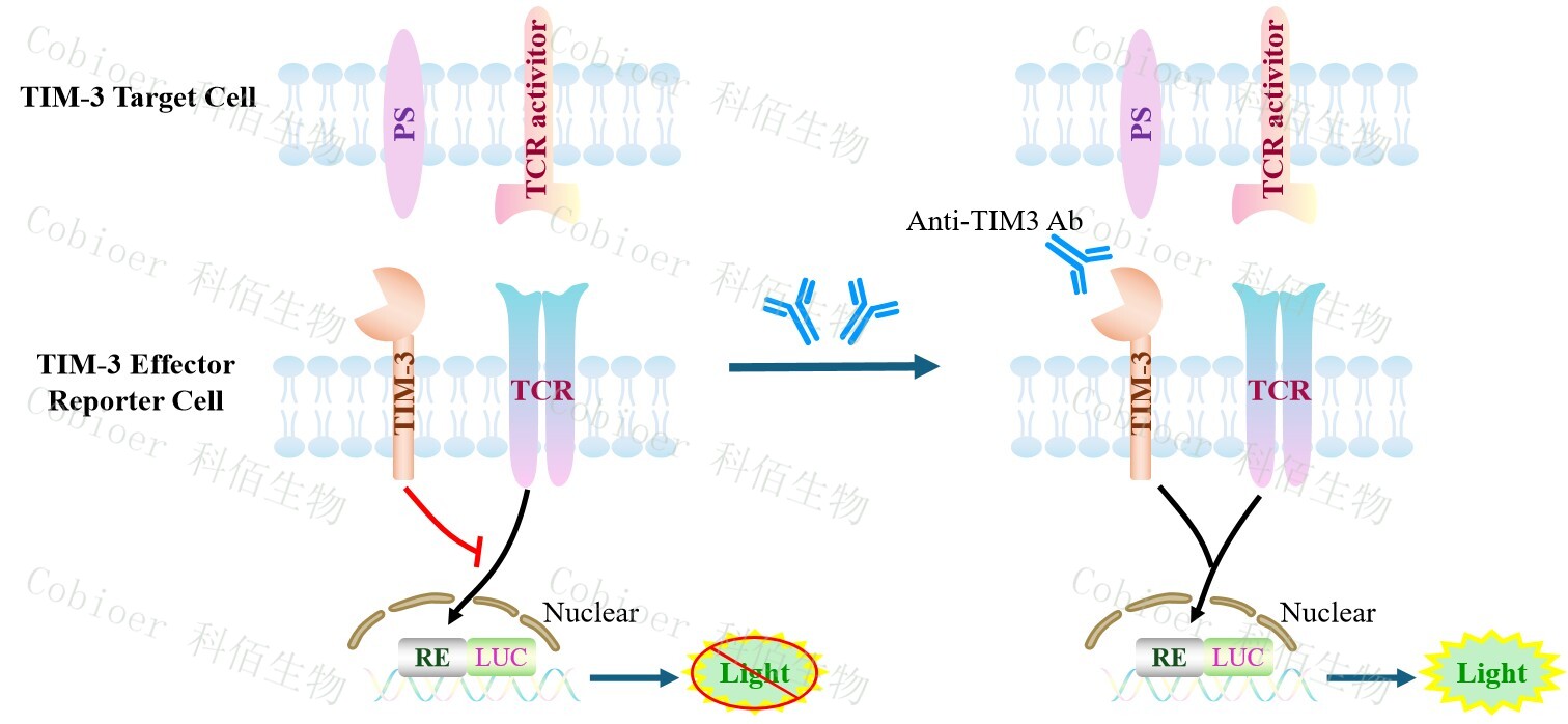 TIM-3 Target Cell 作為 TIM-3 Effector Reporter Cell 的靶細(xì)胞,報(bào)告基因藥靶模型很好的模擬了體內(nèi) TIM-3 的信號(hào)轉(zhuǎn)導(dǎo)過程,原理見下圖所示。![]() Figure 1. TIM-3 Target Cell 細(xì)胞模型原理圖  |