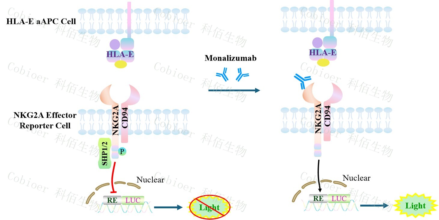 HLA-E aAPC Cell 作為 NKG2A Effector Reporter Cell 的靶細(xì)胞,很好的模擬了體內(nèi) NKG2A &HLA-E 的信號(hào)轉(zhuǎn)導(dǎo)過(guò)程,原理見(jiàn)下圖所示。 ![]() Figure 1. HLA-E aAPC Cell 細(xì)胞模型原理圖  |