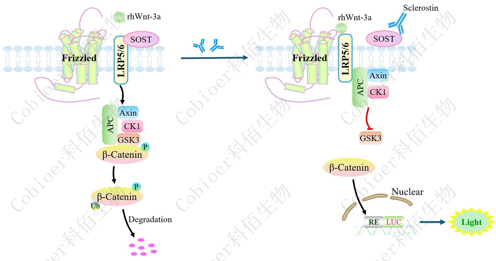 |       Wnt 信號通路是一種進(jìn)化保守的通路,控制發(fā)育的多個(gè)方面,包括成人發(fā)育過程中的 細(xì)胞增殖、細(xì)胞凋亡、細(xì)胞遷移和細(xì)胞極性以及干細(xì)胞維持。 低密度脂蛋白(LDL)受體相關(guān)蛋白 5/6(LRP5/6)是單層跨膜糖蛋白,是典型 Wnt 信號 通路的重要共受體。LRP5/6 有由四個(gè)重復(fù)單元(E1,E2,E3 和 E4)組成的細(xì)胞外結(jié)構(gòu)域 (ECD),且 ECD 是 Wnt 信號傳導(dǎo)的重要調(diào)控位點(diǎn),為 Wnt 配體提供了至少兩個(gè)獨(dú)立的結(jié)合 位點(diǎn)。典型 Wnt 信號通路的激活發(fā)生在 Wnt 配體與其共受體 LRP5/6 結(jié)合,然后與卷曲受 體(FZD)形成復(fù)合物。Wnt-FZD-LRP5/6 復(fù)合體的形成,Axin 介導(dǎo)的破壞復(fù)合體就會通過被 破壞復(fù)合體內(nèi)的其他蛋白質(zhì)磷酸化而轉(zhuǎn)運(yùn)到質(zhì)膜上,從而抑制 b-catenin 的磷酸化。該破壞 復(fù)合體由 Axin、APC、CK1 和 GSK3 組成。 硬化蛋白(SOST)是一種主要在骨細(xì)胞中表達(dá)的分泌糖蛋白。SOST 和 Wnt 蛋白通過 競爭性結(jié)合 LRP5/6,抑制 Wnt 信號傳導(dǎo),抑制新骨的形成和生長。  |