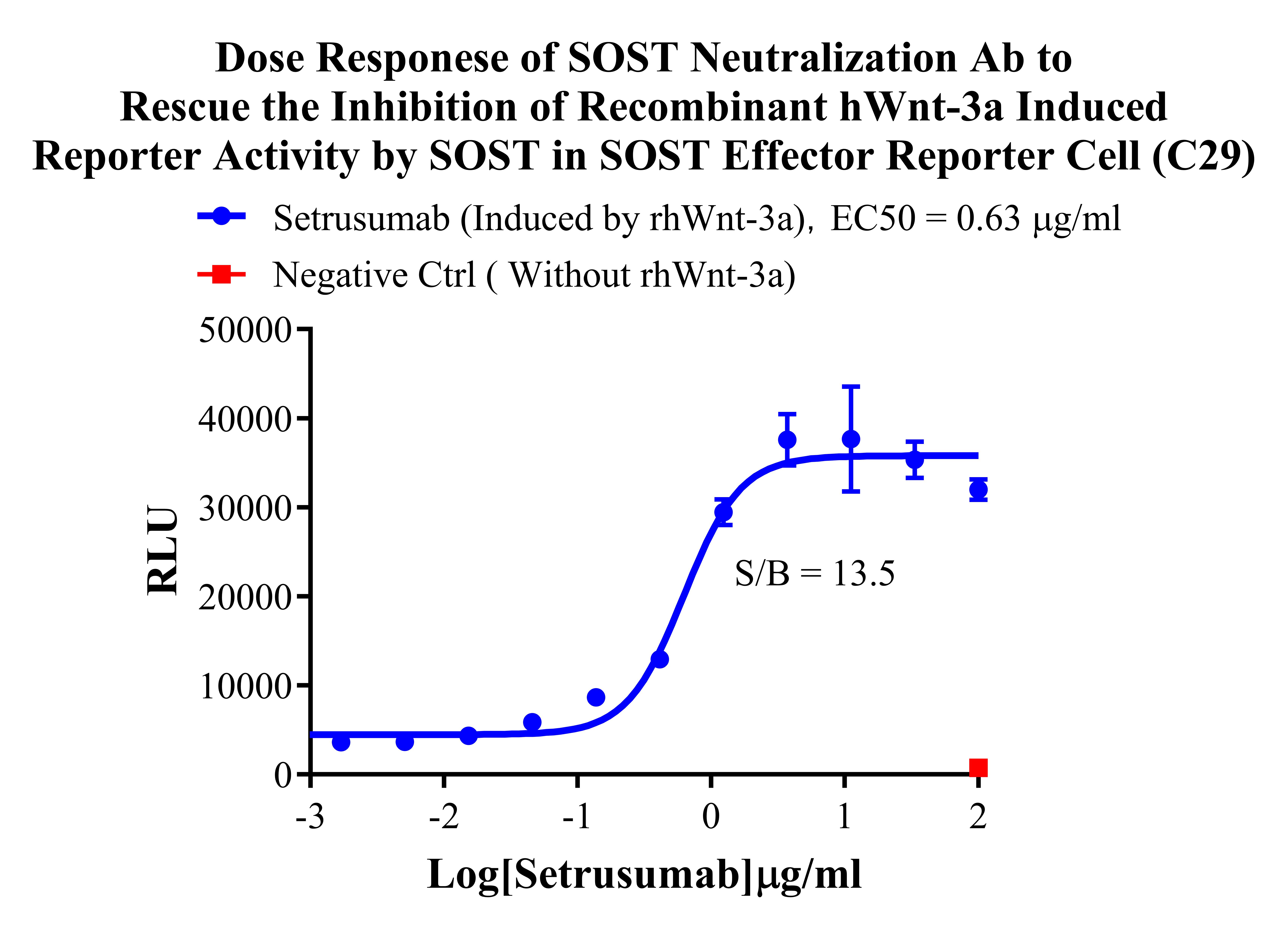 Figure 1. Dose Responese of SOST Neutralization Ab to Rescue the Inhibition of Recombinant hWnt-3a Induced Reporter Activity by SOST in SOST Effector Reporter Cell (C29).  |