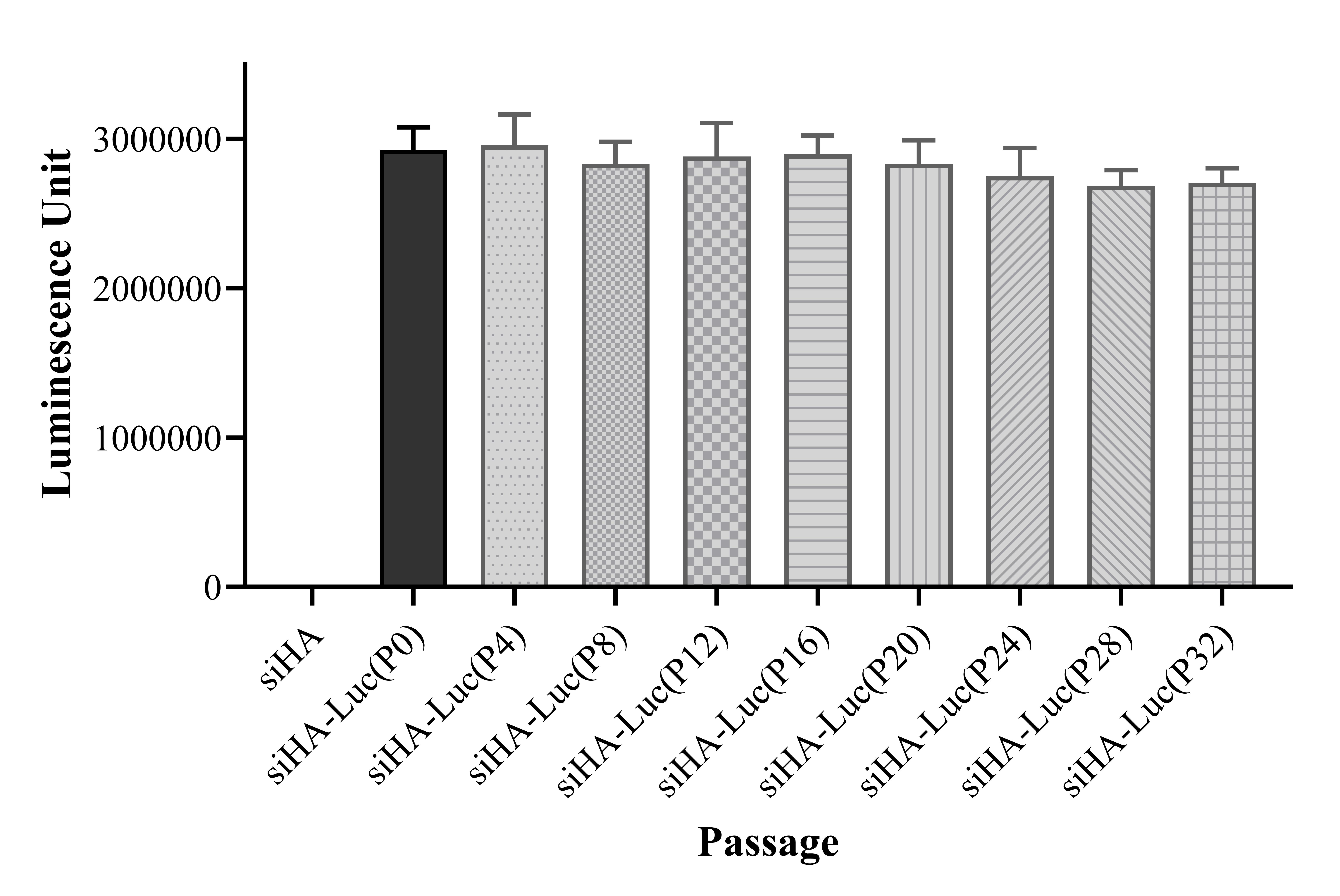 Figure 1. Stablity test results. SiHA-Luc showed at least 32 passage stability with similar luminescence unit.  |