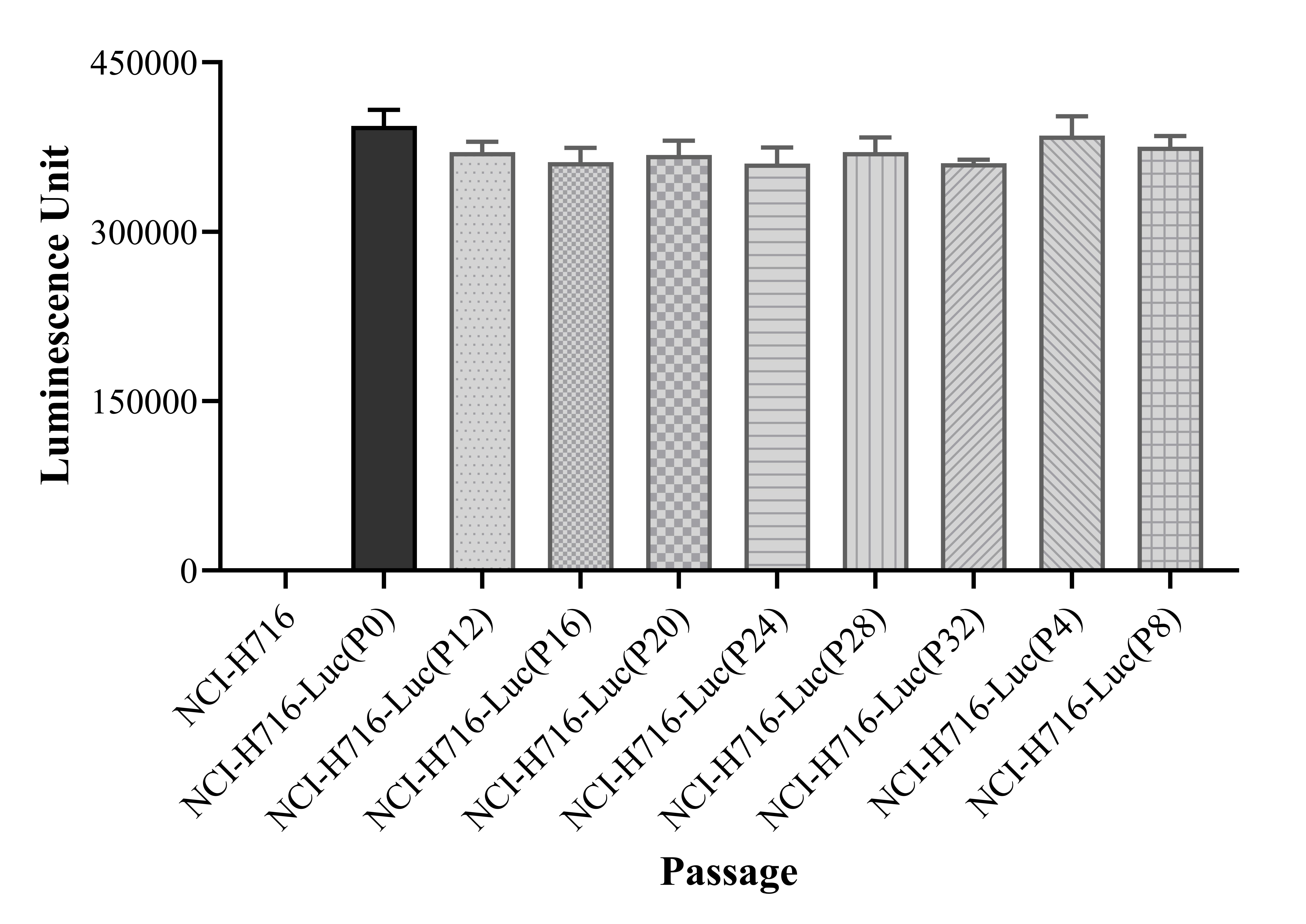 Figure 1. Stablity test results. NCI-H716-Luc showed at least 32 passage stability with similar luminescence unit.  |