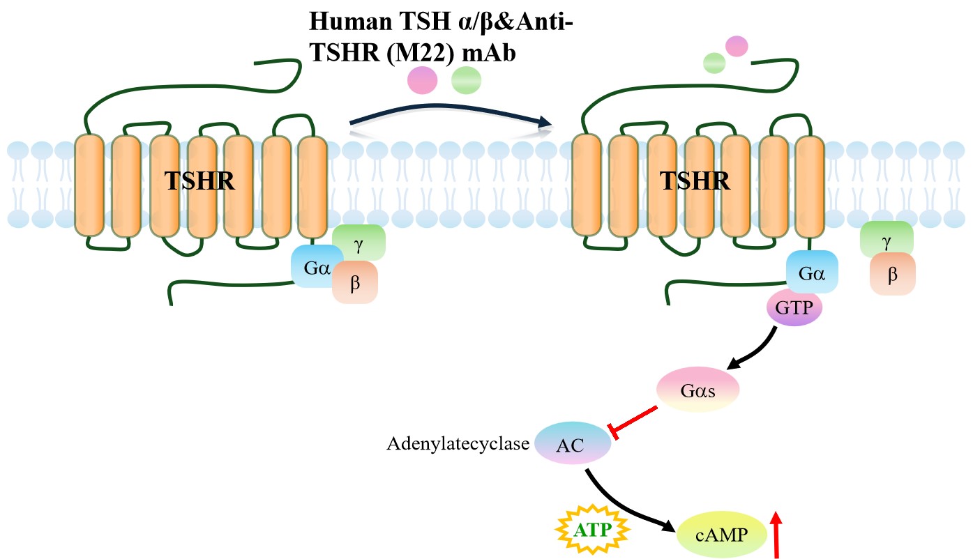 cAMP 在 G 蛋白偶聯(lián)受體(GPCR)信號(hào)轉(zhuǎn)導(dǎo)中是一種關(guān)鍵的第二信使。當(dāng)配體結(jié)合 到 GPCR,構(gòu)象發(fā)生變化,激活受體接著激活 G 蛋白,Gs 的激活導(dǎo)致腺苷酸環(huán)化酶調(diào)控 cAMP 的升高。TSHR 藥靶模型很好的模擬了體內(nèi) TSHR 的信號(hào)轉(zhuǎn)導(dǎo)過程,原理見下圖所示。  |