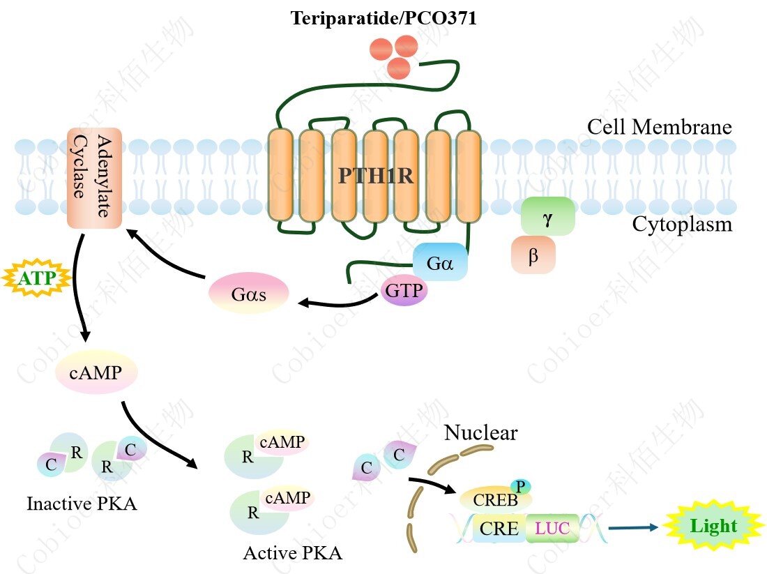 PTH1R CRE-Luc HEK293 報告基因藥靶模型很好的模擬了體內(nèi) PTH1R 的信號轉(zhuǎn)導(dǎo)過程,原理見下圖所示。 ![]() Figure 1. PTH1R CRE-Luc HEK293 細(xì)胞模型原理圖  |