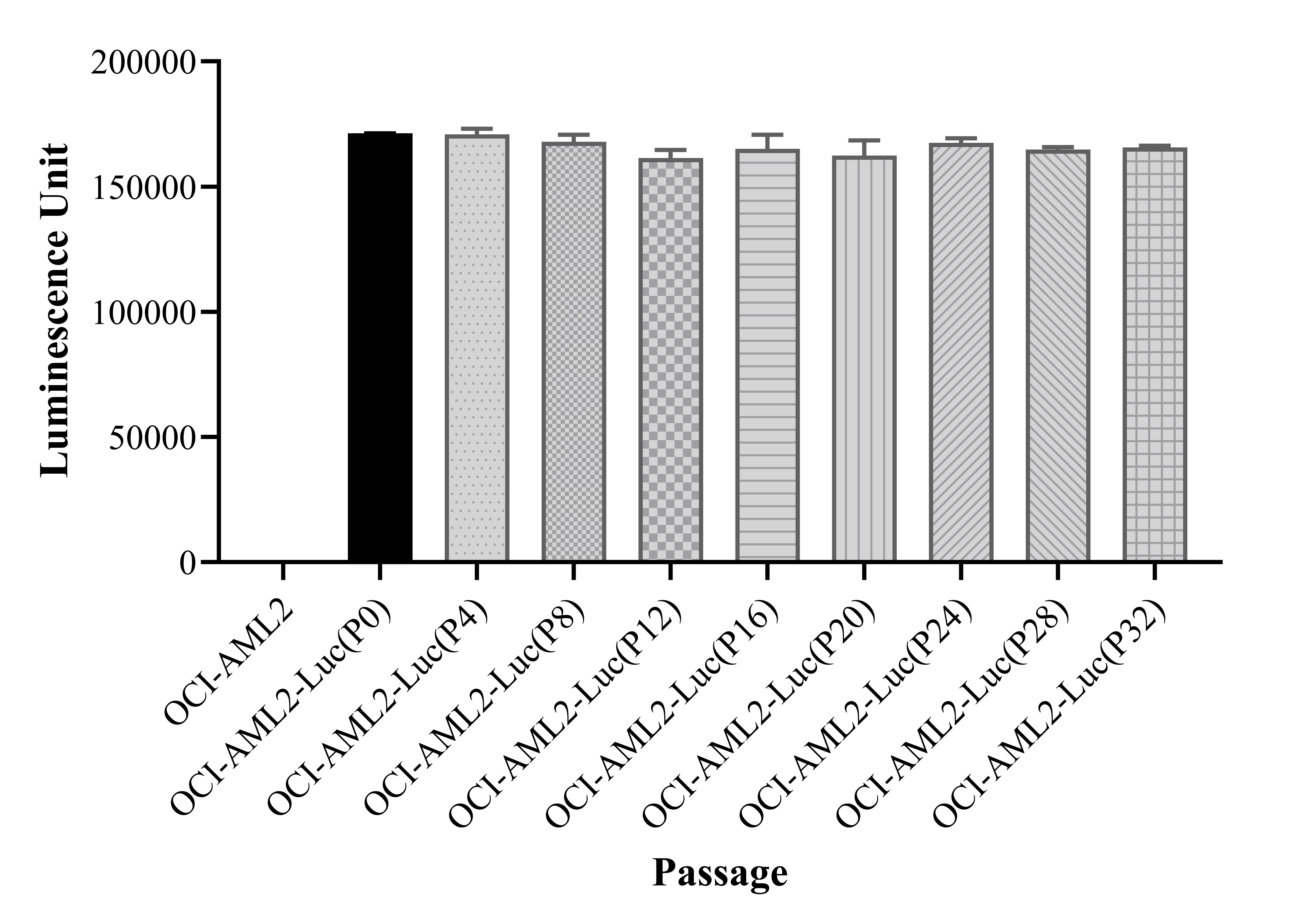 Figure 1. Stablity test results. OCI-AML2-Luc showed at least 32 passage stability with similar luminescence unit.  |