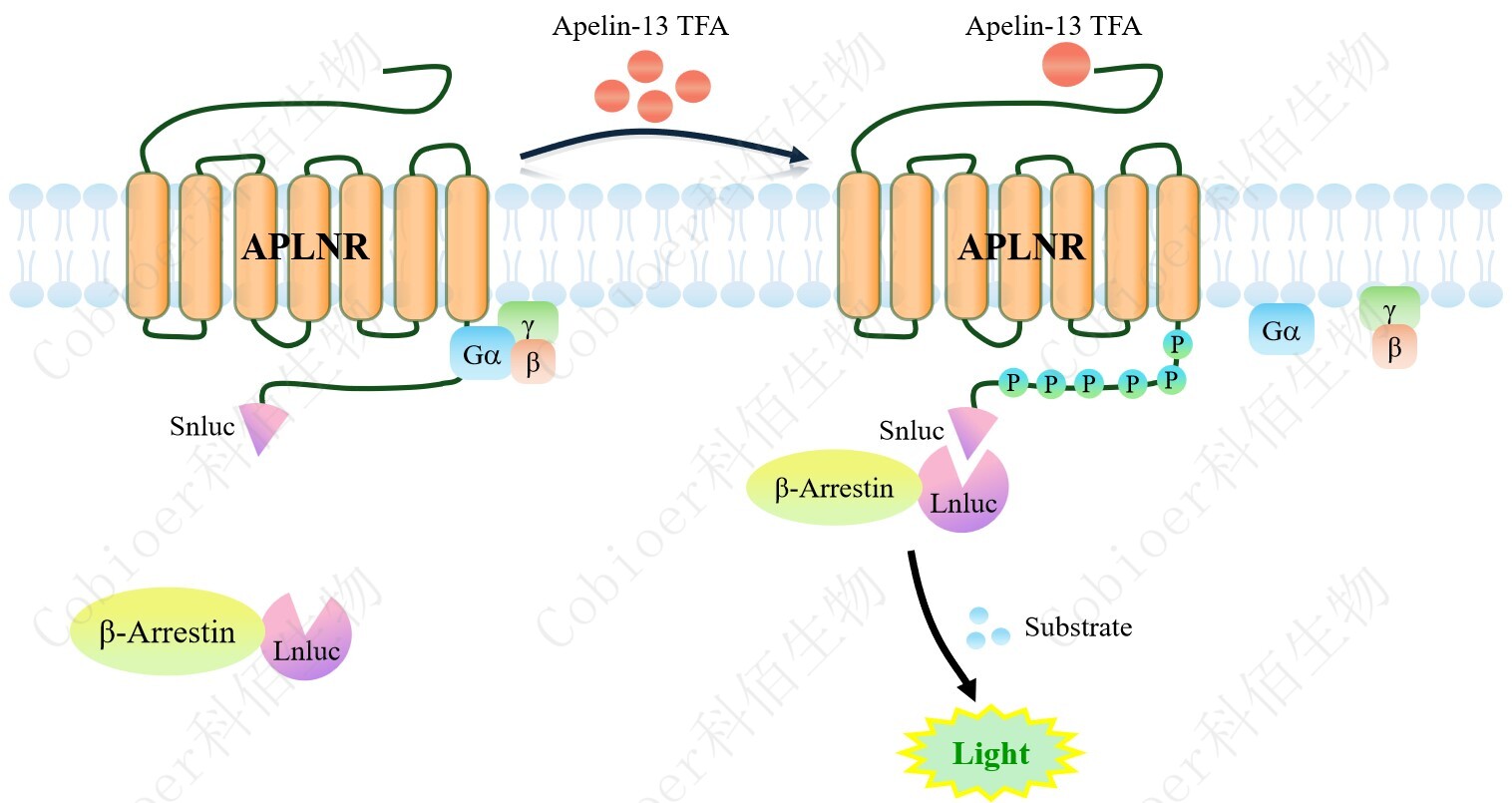 APLNR(APJ) β-Arrestin CHO 報(bào)告基因藥靶模型很好的模擬了體內(nèi) APLNR(APJ) /β-Arrestin 的信號(hào)轉(zhuǎn)導(dǎo)過(guò)程,原理見(jiàn)下圖所示。當(dāng)缺乏配體刺激時(shí),β-Arrestin 不與 APLNR (APJ)結(jié)合,融合β-Arrestin 的熒光素酶處于失活構(gòu)象,當(dāng) APLNR(APJ)遭遇配體刺激 時(shí),融合熒光素酶報(bào)告基因的β-Arrestin 被招募,使熒光素酶報(bào)告基因處于激活狀態(tài),加入 其底物后發(fā)光信號(hào)增強(qiáng)。![]() Figure 1. APLNR(APJ) β-Arrestin CHO 細(xì)胞模型原理圖  |