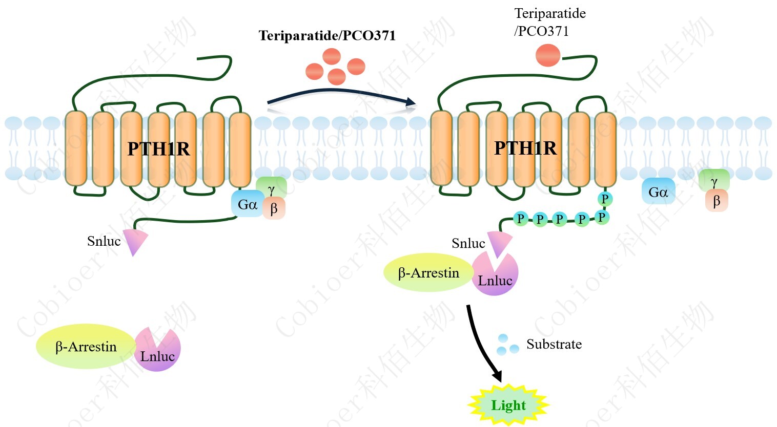 PTH1R β-Arrestin CHO PTH1R β-Arrestin CHO 報(bào)告基因藥靶模型很好的模擬了體內(nèi) PTH1R/β-Arrestin 的信號(hào) 轉(zhuǎn)導(dǎo)過(guò)程,原理見(jiàn)下圖所示。當(dāng)缺乏配體刺激時(shí),β-Arrestin 不與 PTH1R 結(jié)合,融合β- Arrestin 的熒光素酶處于失活構(gòu)象,當(dāng) PTH1R 遭遇配體刺激時(shí),融合熒光素酶報(bào)告基因的 β-Arrestin 被招募,使熒光素酶報(bào)告基因處于激活狀態(tài),加入其底物后發(fā)光信號(hào)增強(qiáng)。 ![]() Figure 1. PTH1R β-Arrestin CHO 細(xì)胞模型原理圖  |