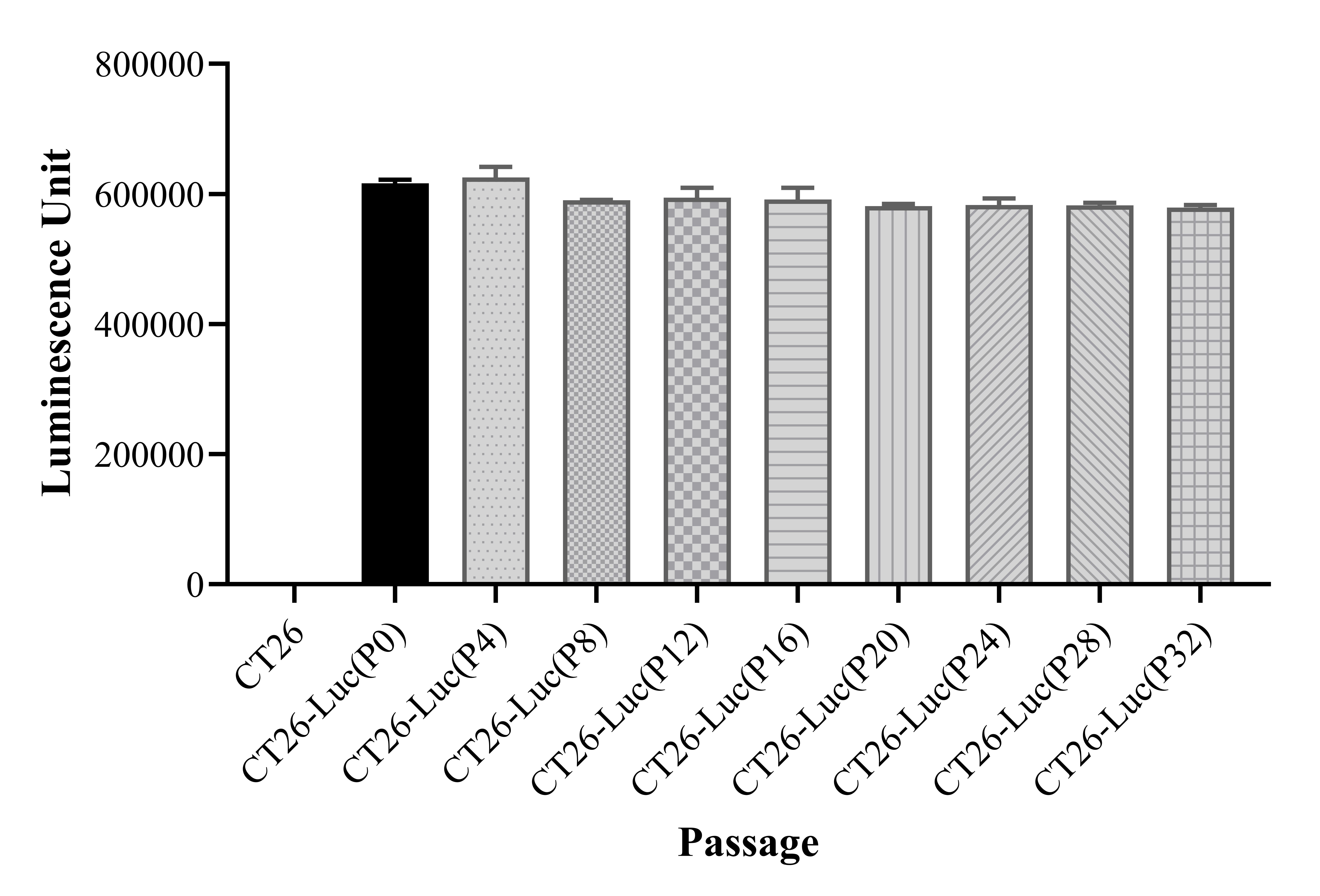 Figure 1. Stablity test results. CT26-Luc showed at least 32 passage stability with similar luminescence unit.  |