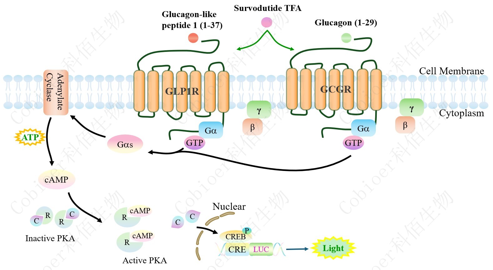 GLP1R&GCGR Dual Reporter Cell 報(bào)告基因藥靶模型很好的模擬了體內(nèi) GLP1R&GCGR 的信號(hào)轉(zhuǎn)導(dǎo)過(guò)程,原理見(jiàn)圖 1 所示。