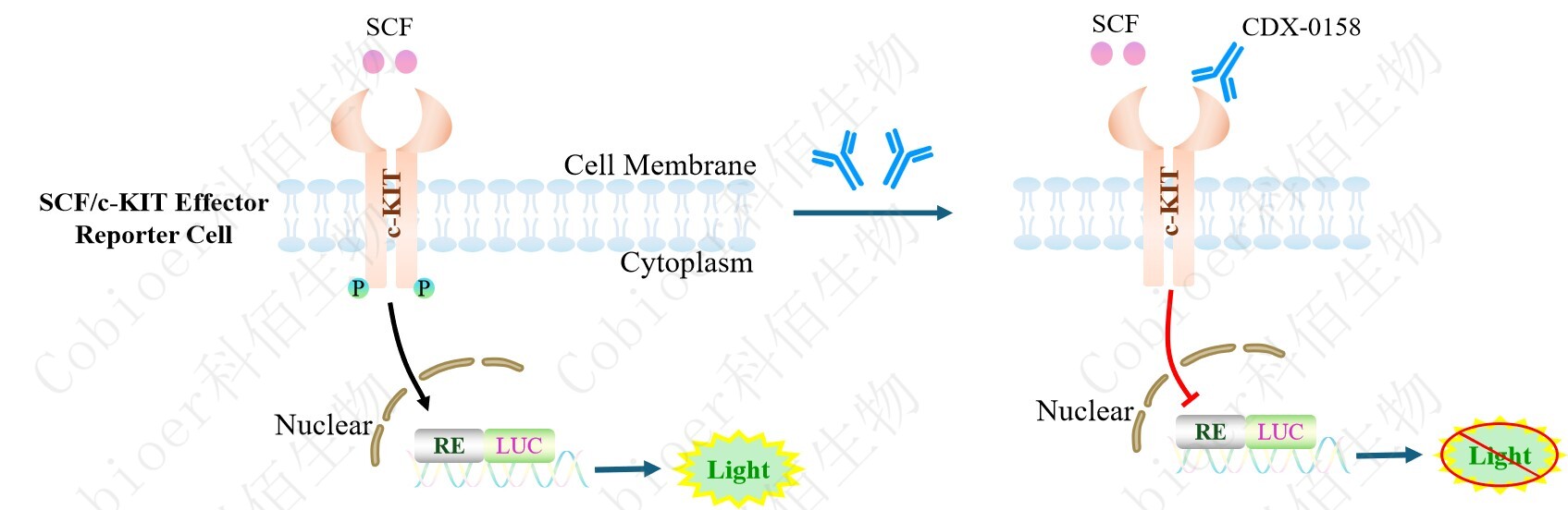 SCF/c-KIT Effector Reporter Cell 報(bào)告基因藥靶模型很好的模擬了體內(nèi) SCF/c-KIT 的信號(hào)轉(zhuǎn)導(dǎo)過程,原理見下圖所示。