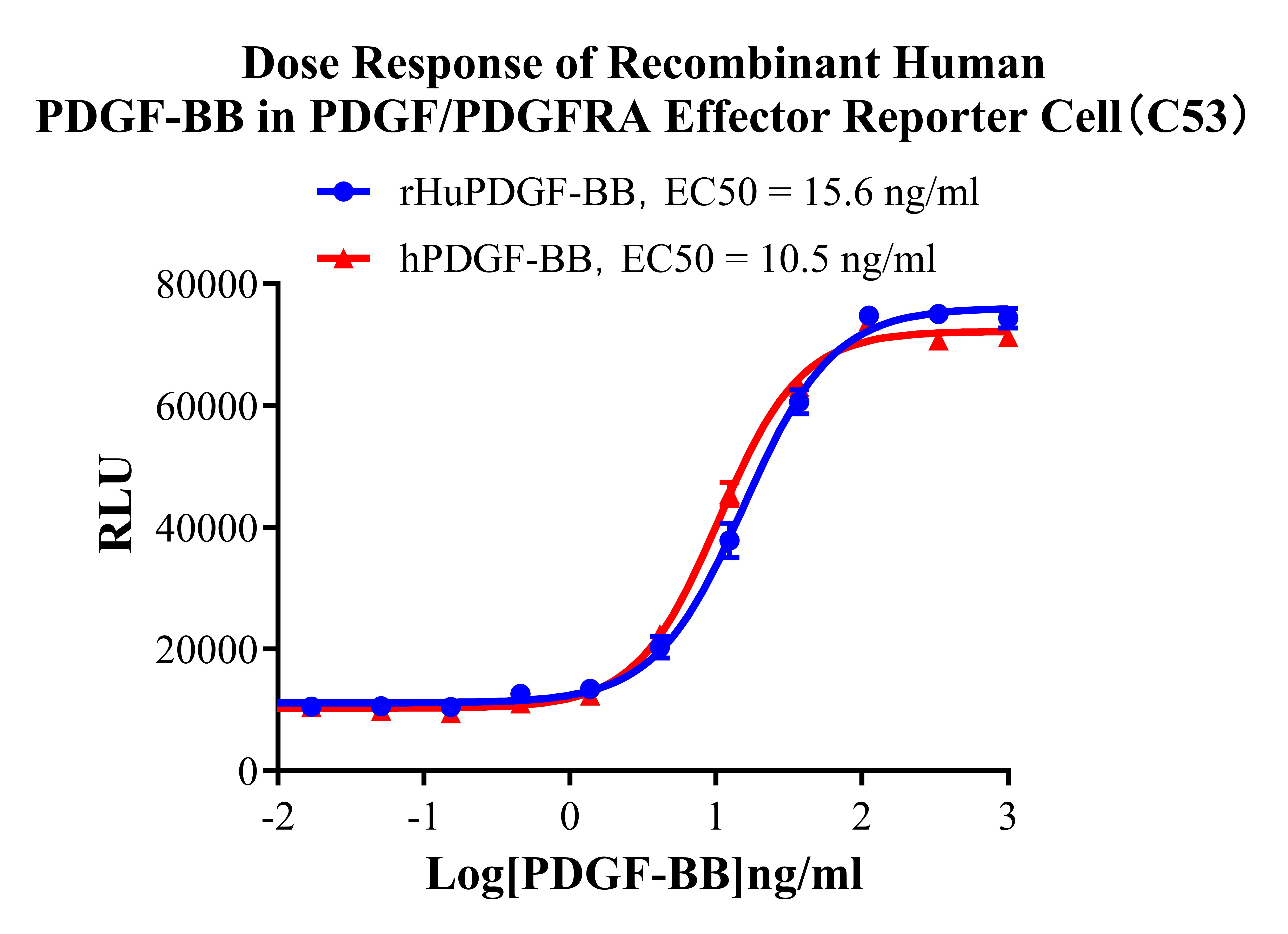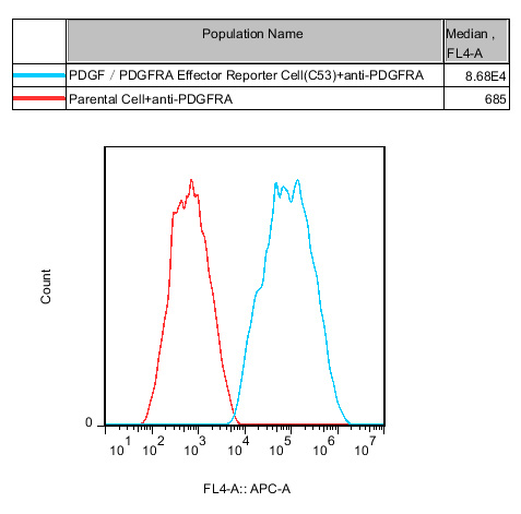 IV. Representative Data![]() Figure 2. Recombinant PDGF/PDGFRA Effector Reporter Cell stably expressing PDGFRA. ![]() Figure 3. Dose Response of Recombinant Human PDGF-BB in PDGF/PDGFRA Effector Reporter Cell(C53). ![]() Figure 4. Inhibition of Human PDGF-BB-induced Reporter Activity by PDGFB Neutralization Ab in PDGF/PDGFRA Effector Reporter Cell(C53). Inhibition of Human PDGF-BB-induced Reporter Activity by PDGFRA Blocking Ab in PDGF/DGFRA Effector Reporter Cel(C53).  |