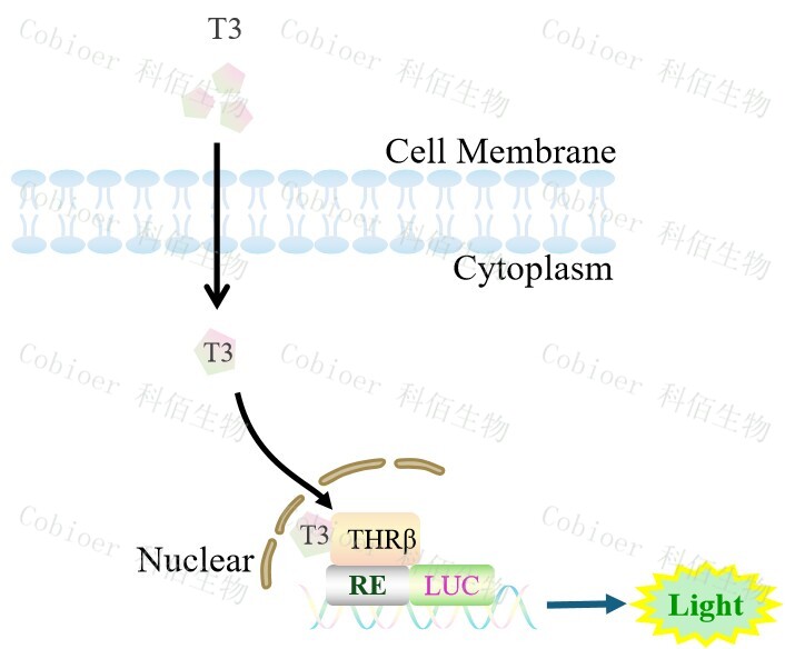 THRB Luciferase Reporter HEK293,是由 THRB 調控并表達 Luc 熒光素 酶報告基因的 HEK293 細胞。甲狀腺激素(T3/T4)是一種有效的甲狀腺激素,主要通過結 合 TRs 發(fā)揮作用,調控基因表達和細胞功能,原理見下圖所示。![]() Figure 1. THRB Luciferase Reporter HEK293 原理示意圖