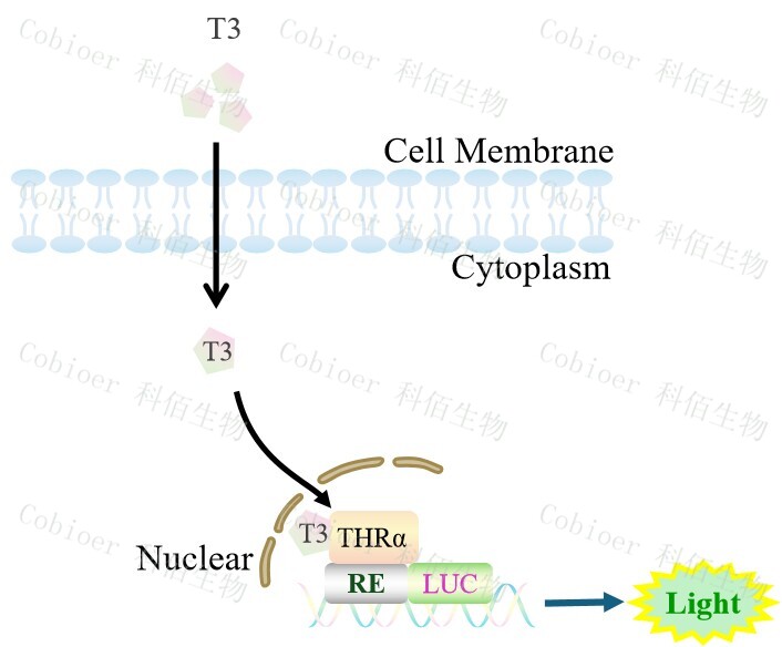 THRA Luciferase Reporter HEK293,是由 THRA 調(diào)控并表達(dá) Luc 熒光素 酶報(bào)告基因的 HEK293 細(xì)胞。甲狀腺激素(T3/T4)是一種有效的甲狀腺激素,主要通過(guò)結(jié) 合 TRs 發(fā)揮作用,調(diào)控基因表達(dá)和細(xì)胞功能,原理見下圖所示。 ![]() Figure 1. THRA Luciferase Reporter HEK293 原理示意圖