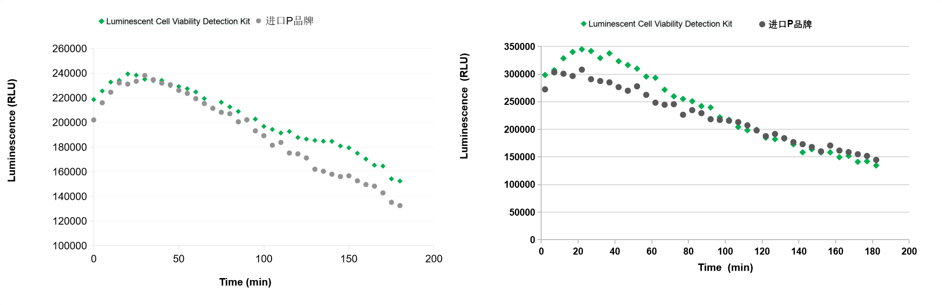 2. 半衰期 ![]() Figure 3. 生物發(fā)光穩(wěn)定性的檢測。分別使用Luminescent Cell Viability Detection Kit和進(jìn)口P公司同類對(duì)照對(duì)2萬個(gè)/孔CTLL-2細(xì)胞(左圖)和5萬個(gè)/孔UC-MSC細(xì)胞(右圖)進(jìn)行持續(xù)3小時(shí)的生物發(fā)光強(qiáng)度檢測。