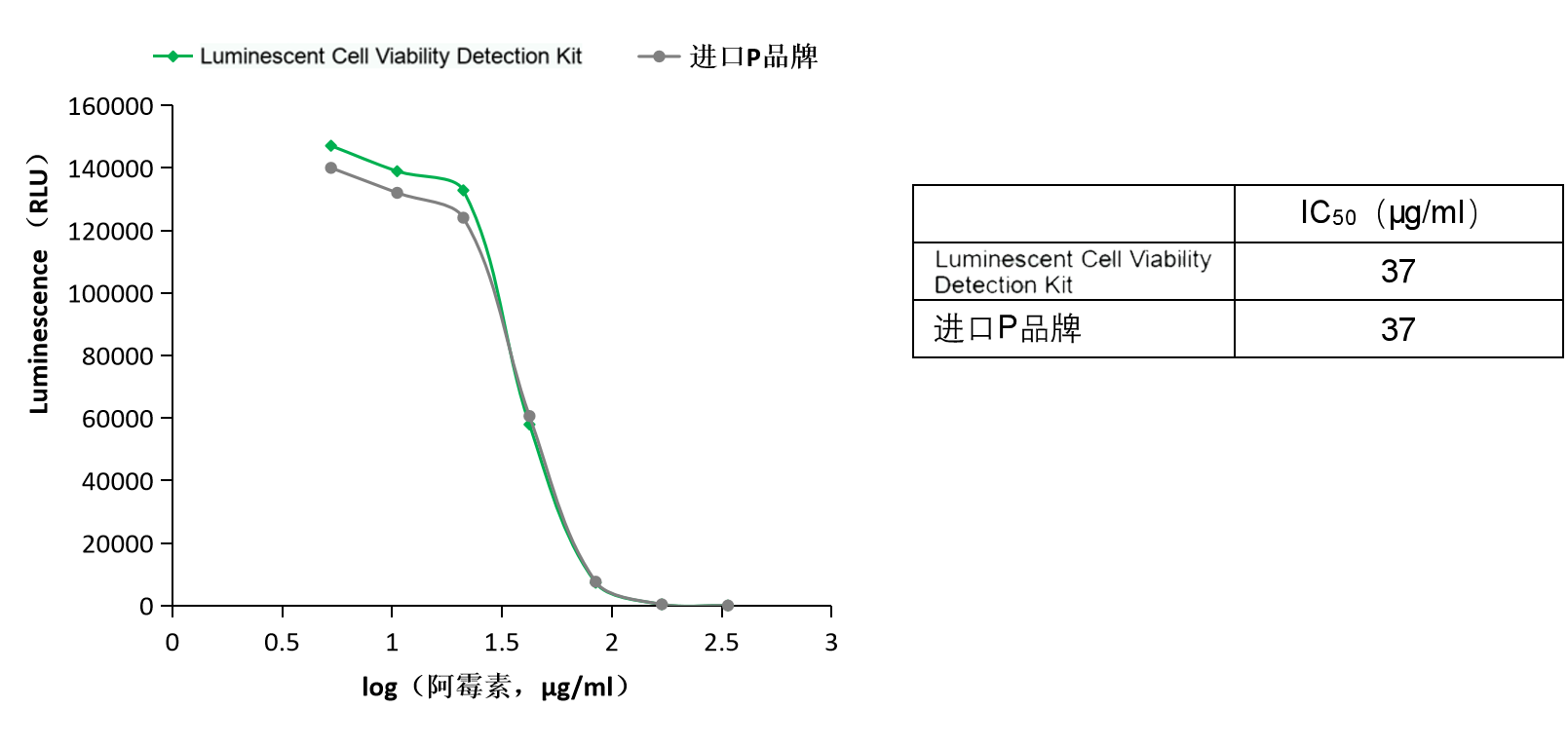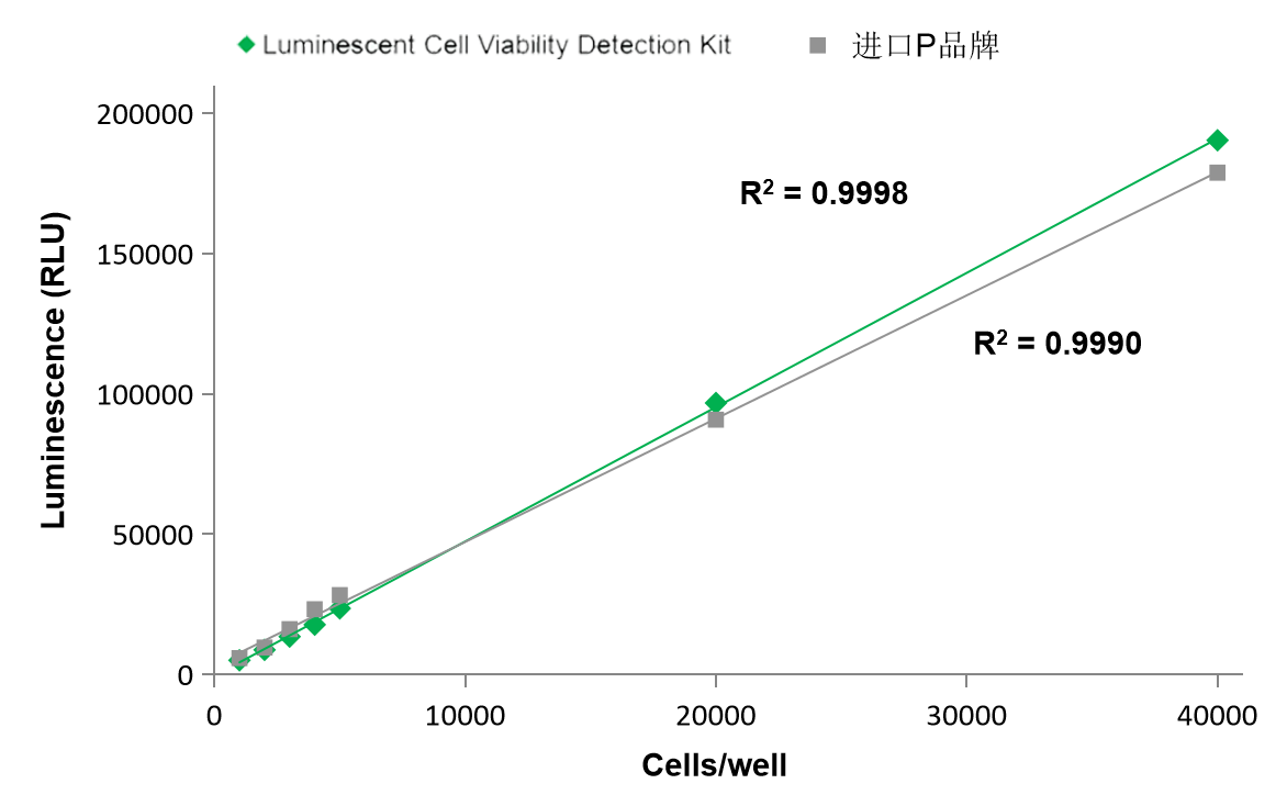 3. 線性 ![]() Figure 4. 比較不同細(xì)胞數(shù)的線性范圍。分別使用Luminescent Cell Viability Detection Kit和進(jìn)口P公司同類對(duì)照檢測不同數(shù)量CHO-K1細(xì)胞(CD-CHO培養(yǎng)基)在黑色96孔板中生物發(fā)光強(qiáng)度,制成標(biāo)準(zhǔn)曲線。