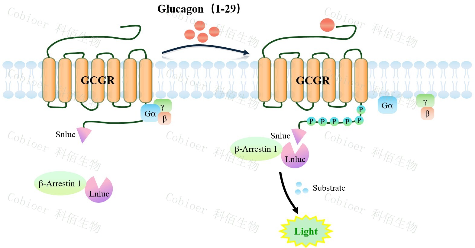 GCGR β-Arrestin 1 CHO 報告基因藥靶模型很好的模擬了體內 GCGR/β-Arrestin 1 的信 號轉導過程,原理見下圖所示。當缺乏配體刺激時,β-Arrestin 1 不與 GCGR 結合,融合β- Arrestin 1 的熒光素酶處于失活構象;當 GCGR 遭遇配體刺激時,融合熒光素酶報告基因的 β-Arrestin 1 被招募,使熒光素酶報告基因處于激活狀態(tài),加入其底物后發(fā)光信號增強。![]() Figure 1. GCGR β-Arrestin 1 CHO 細胞模型原理圖  |