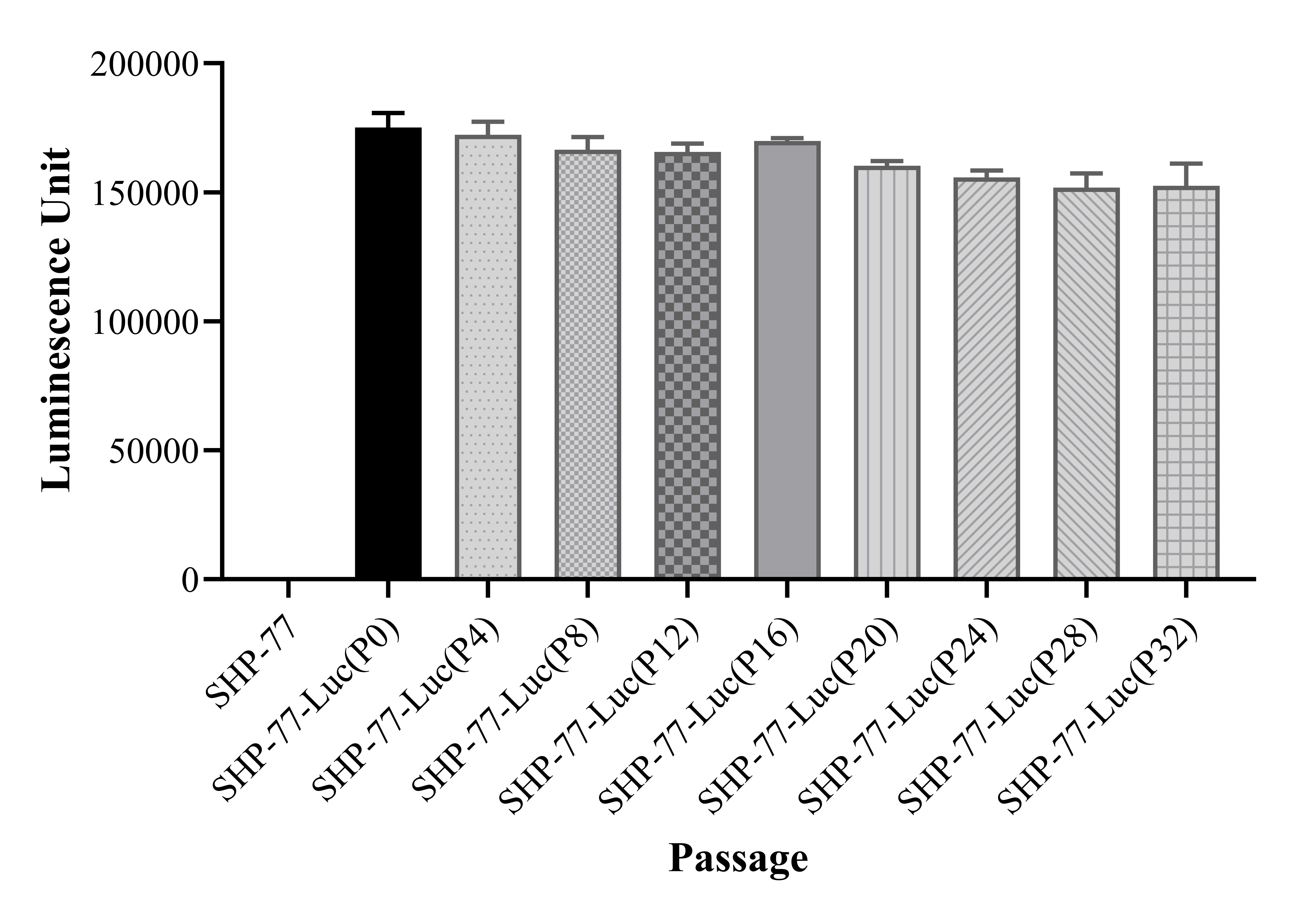 Figure 1. Stablity test results. SHP-77-Luc showed at least 32 passage stability with similar luminescence unit.  |