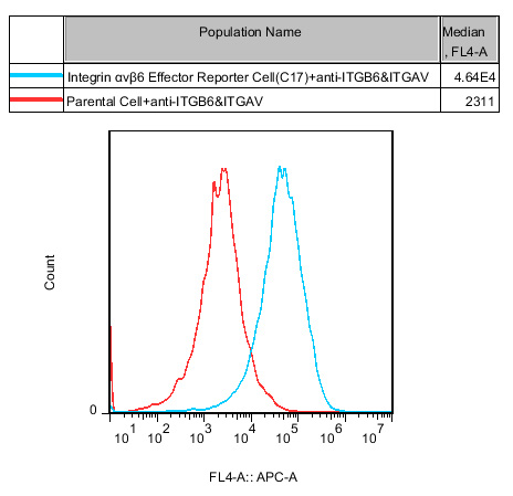 IV. Representative Data![]() Figure 2. Recombinant Integrin avβ6 Effector Reporter Cell stably expressing ITGB6&ITGAV. ![]() Figure 3. Dose Response of Recombinant Human Latent TGFβ1 in Integrin avβ6 Effector Reporter Cell (C17). ![]() Figure 4. Inhibition of Human Latent TGFβ1-induced Reporter Activity by Integrin avβ6 Blocking Antibody in Integrin avβ6 Effector Reporter Cell(C17). ![]()  |